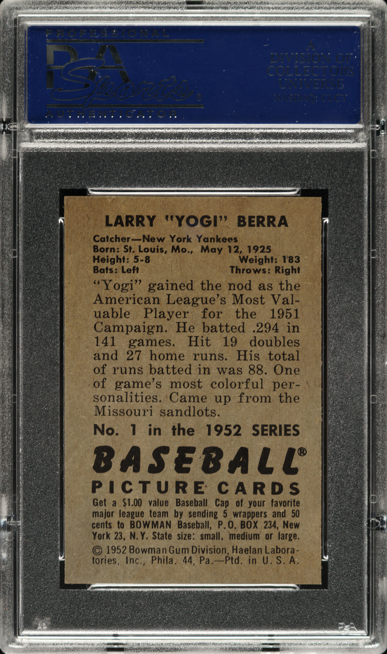 Graded NM 7 by PSA. New York Yankees Hall of Famer Yogi Berra.