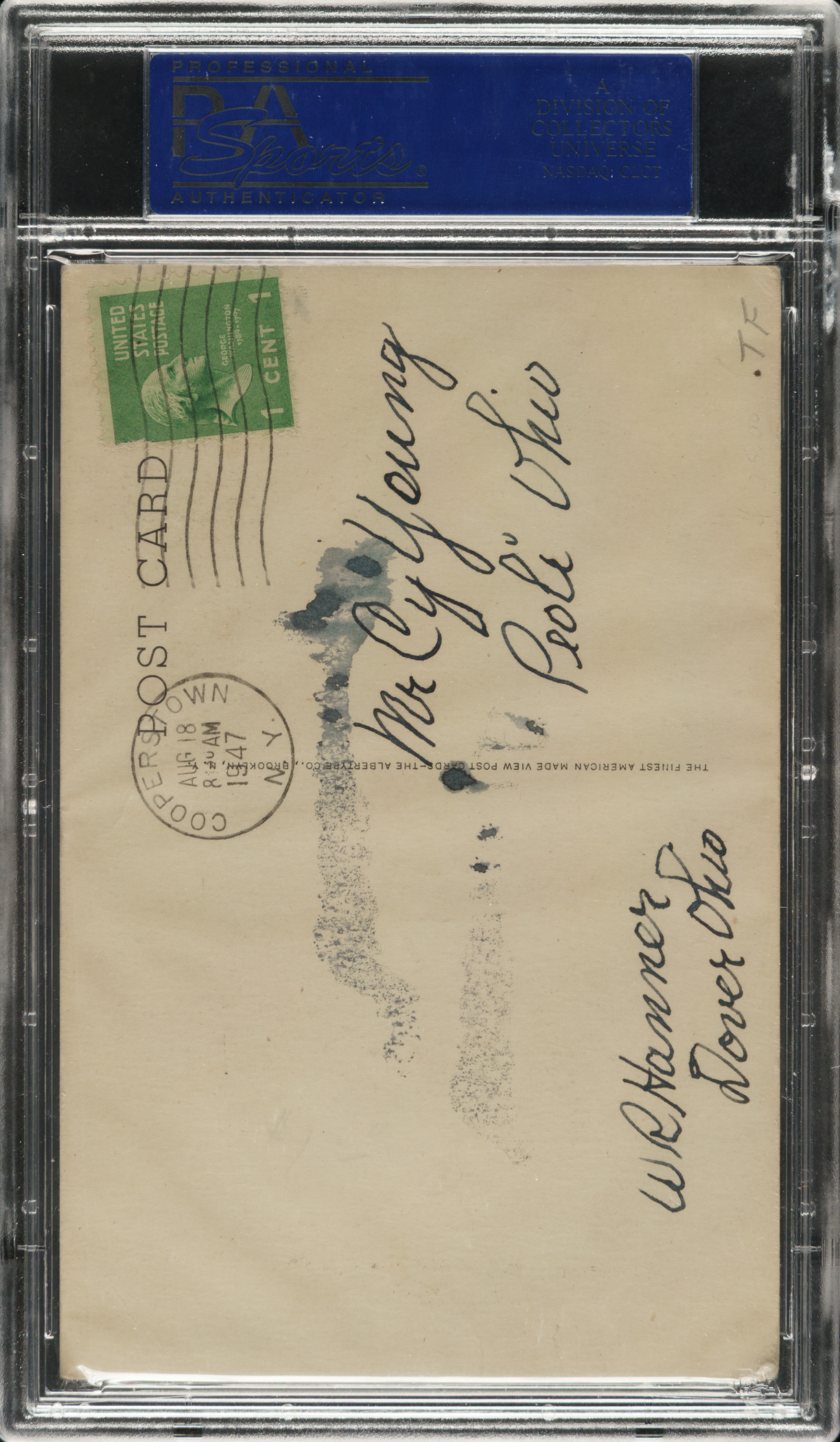 Black-and-white Hall of Fame plaque postcard (Albertype, Type 1) of pitcher Cy Young signed by him in black ink along the base. PSA/DNA has encapsulated the card and certified the signature as “Authentic.” Cy Young is one of the most desirable of all signed black-and-white Hall of Fame postcards. Black-and-white Hall of Fame postcards were issued only between the years 1944 and 1963. Young was elected to the Hall of Fame in 1937, and he died in 1955. The postcard (3.5 x 5.5 inches) has been addressed and mailed on the reverse and has a couple of creases. Technically in Fair condition.