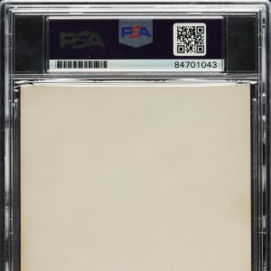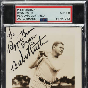 Postcard-size photo, capturing the "Sultan of Swat" in a classic batting pose as a member of the Yankees, boldly signed by Babe Ruth in black fountain pen. Encapsulated by PSA/DNA, with the signature graded MINT 9. Ruth has inscribed the photo "To Reggie Brown/From/Babe Ruth" in the upper-left corner. Both Ruth's inscription and signature contrast exceptionally well against the white background. It is interesting to note that Babe Ruth had these photos specially produced expressly for the purpose of fulfilling autograph requests (sometimes they are found with a postcard back; the offered example is blank backed). The photo (3.5 x 5.5 inches) is in apparent Vg-Ex condition. This is a classic Ruth-signed photo.