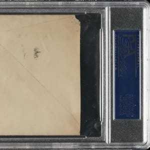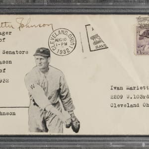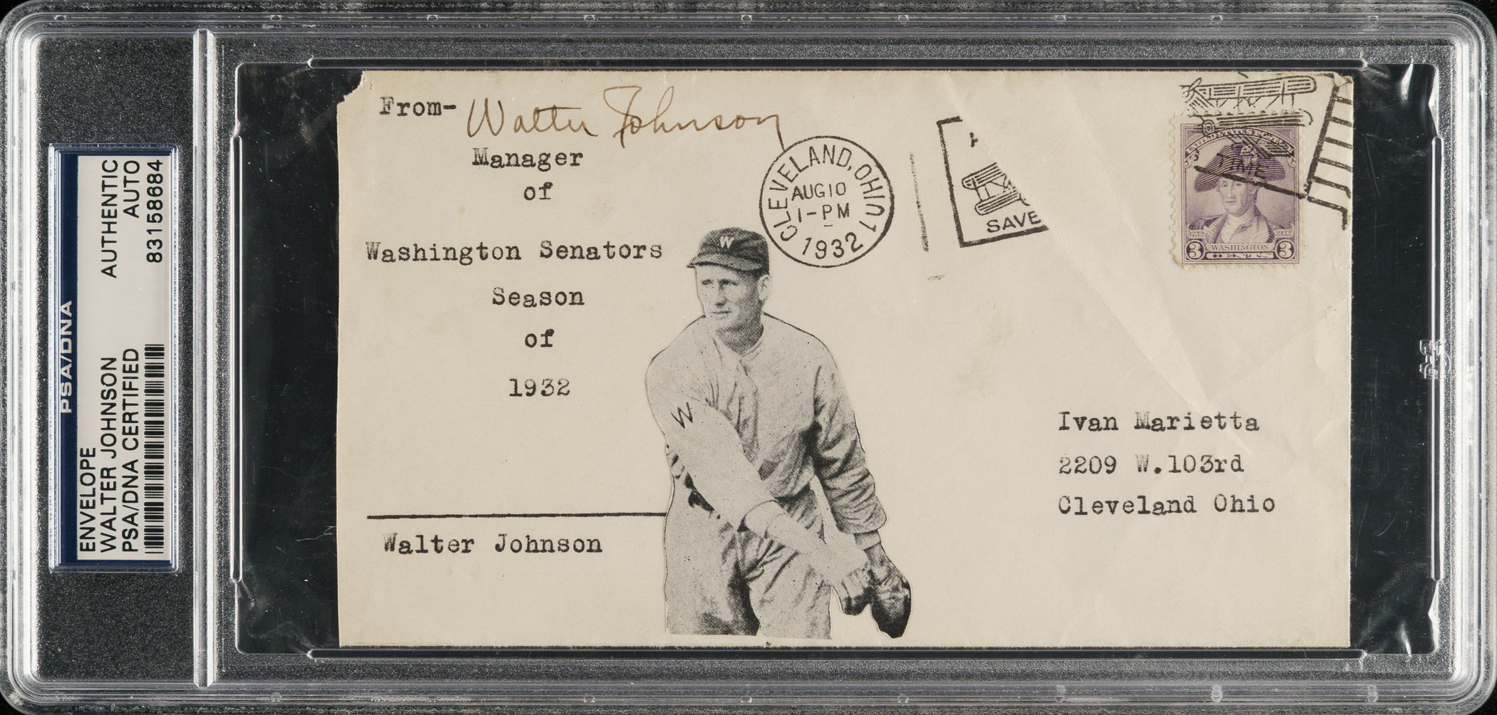 Envelope signed by Washington Senators Hall of Famer Walter Johnson in black ink. Encapsulated by PSA/DNA, with the signature certified as "Authentic." The envelope bears a "Aug 10, 1932, Cleveland, Ohio" postmark and three-cent stamp. A magazine photo of Johnson has been affixed to the front. The envelope (6-1/2 x 3-5/8 inches) displays moderate-to-heavy creases and a chipped upper-left corner. In Fair to Good condition.