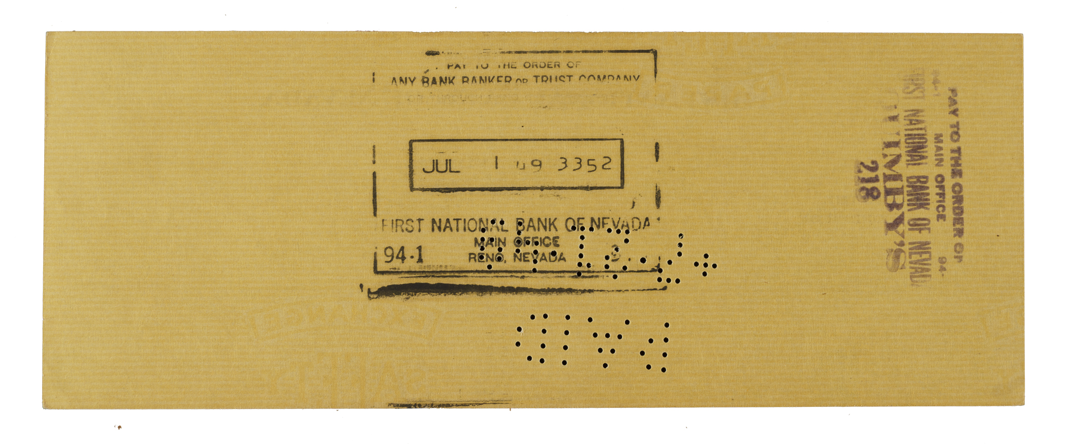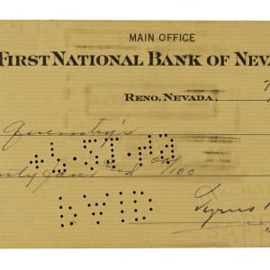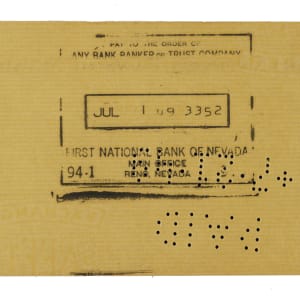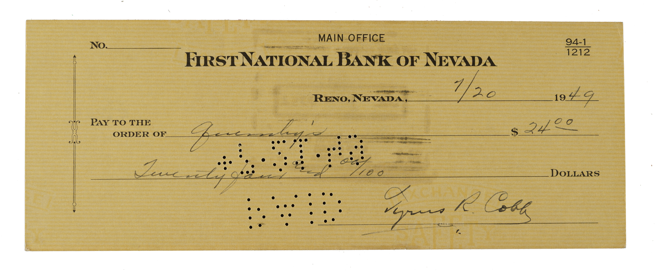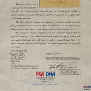 Bank check dated July 20, 1949, and signed in black ink along the base by Detroit Tigers Hall of Fame outfielder Ty Cobb. The check, drawn on the First National Bank of Nevada, is made out to “Quimby's” in the amount of $24. There are two stamped endorsements on the reverse. The check (8.5 x 3 inches) has normal bank cancellation stamps and perforations as well as light wrinkles. In Excellent condition overall. Full LOA from PSA/DNA.