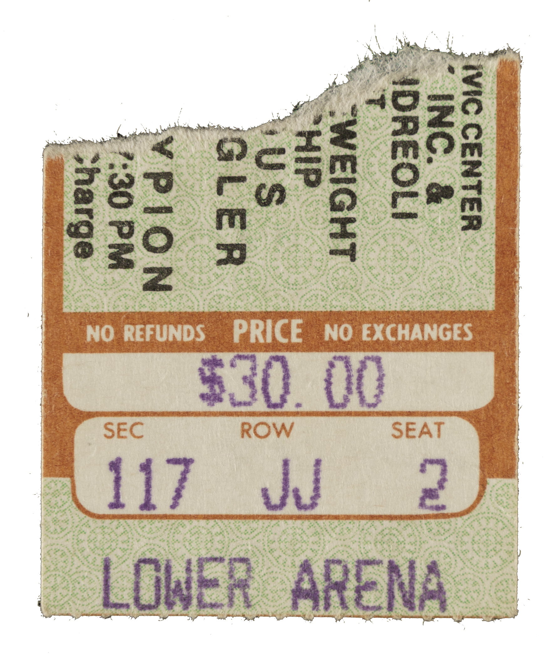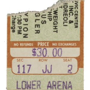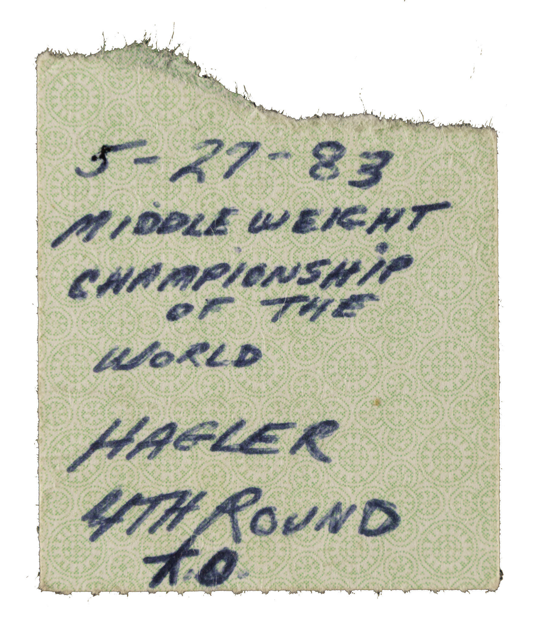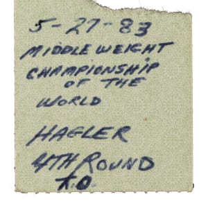 Ticket stub issued for the middleweight championship fight between Marvin Hagler and Wilford Scypion on May 27, 1983, at the Civic Center in Providence, Rhode Island. Hagler overwhelmed Scypion from the opening bell, winning the fight via knockout in the fourth round. The win marked Hagler's eighth successful title defense and further cemented his supremacy atop the division. The ticket sub (1.5 x 1.5 inches) bears handwritten notations about the fight on the back and is in Good condition overall.