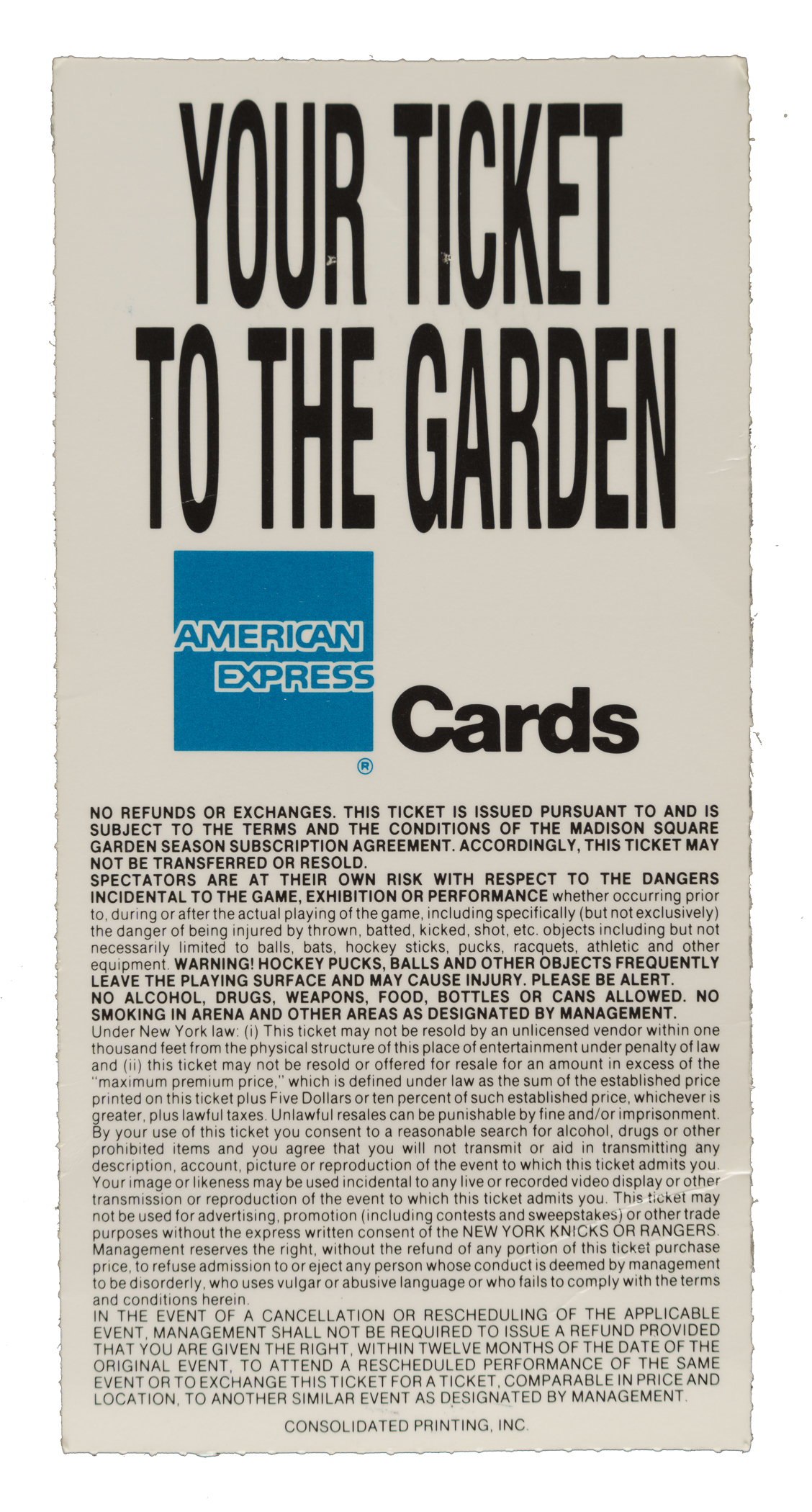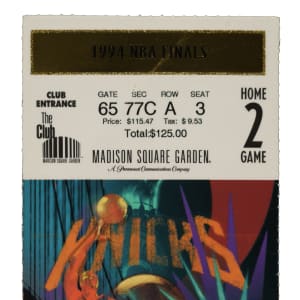 New York Knicks ticket stub issued for Game 4 of the 1994 NBA Finals against the Houston Rockets at Madison Square Garden on June 15. The Knicks defeated the Rockets 91-82 to even the series, despite 32 points from Houston's Hall of Fame center Hakeem Olajuwon. The ticket stub (2-7/8 x 5-3/4 inches) displays scattered creasing and is in Good condition overall.