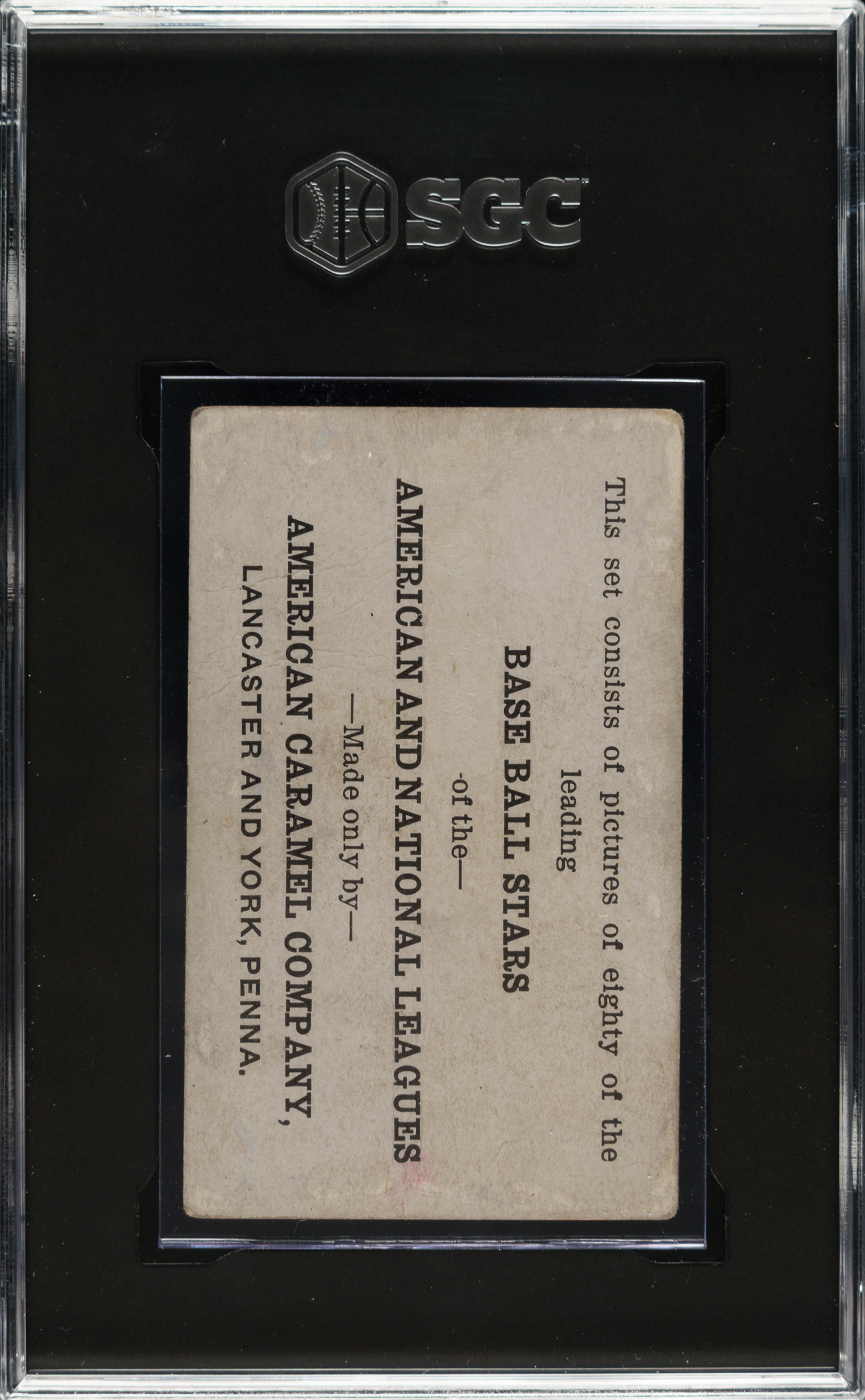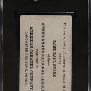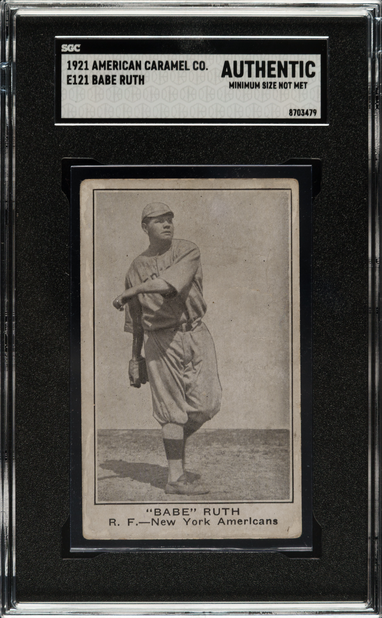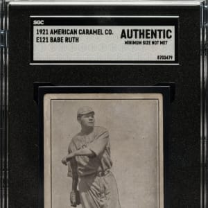 Presented is a very attractive low-grade E121 American Caramel card of Babe Ruth. This is one of the premier early Ruth cards and one of the very few dating from the early 1920s. While the image of Ruth is crisp, the card has various condition issues, including even wear to the corners, scattered creases, and light soiling. Boldly printed reverse. Encapsulated as "Authentic" by SGC (minimum size not met). It is interesting to note that the young but already very celebrated Ruth is pictured on this card in a Boston uniform, though he is identified as a member of the New York Americans. "Boston" (mostly covered by Ruth's throwing arm) can be clearly seen across Ruth's chest upon close examination. In fact, this photograph of Ruth is the very same image that was used on Ruth's 1917 E135 Collins-McCarthy candy card. Apparently the American Caramel Company was going to print and did not have the time to pursue an updated image of Ruth with his new team. This is ideal for someone who wants a real example of this classic Babe Ruth card, from the heart of his playing days, without spending the tens of thousands of dollars that a higher-graded example would command.