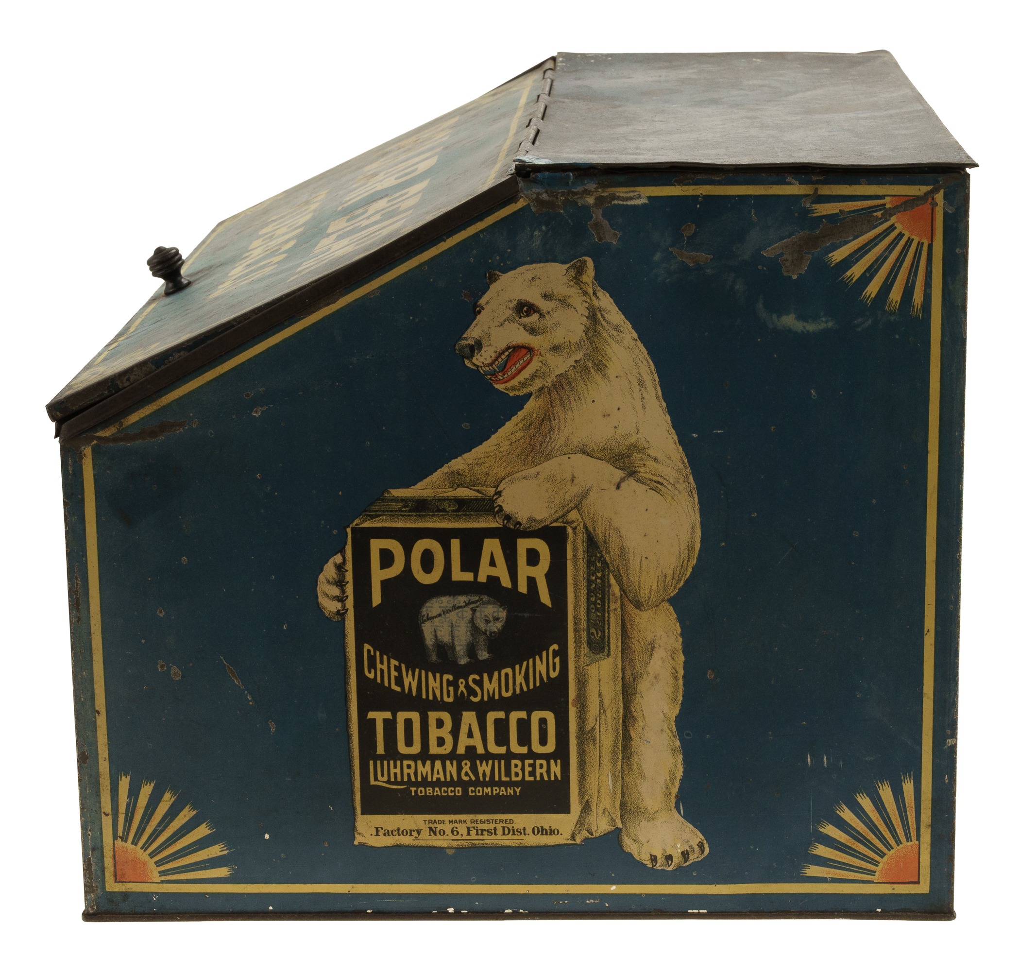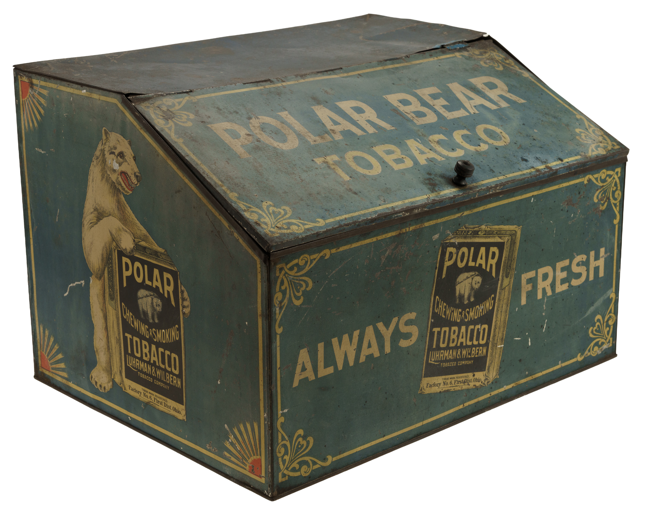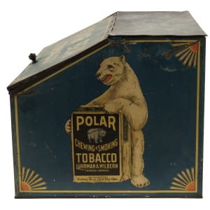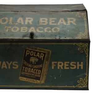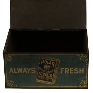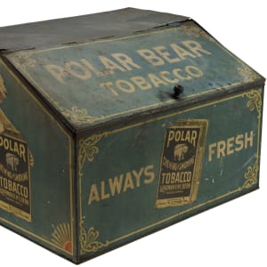 Rare tin display box, dating from the early 1900s, that once housed packages of "Polar Chewing and Smoking Tobacco." Each of the side panels features a color illustration of a polar bear holding a large package of Polar Tobacco. The hinged front lid is lettered "Polar Bear Tobacco," while the front panel reads "Always Fresh." An illustrated image of a Polar Tobacco package also appears on the front panel. While we have handled porcelain signs issued in promotion of this tobacco brand, this is just the second large retail tin display we have ever offered. The box (18 x 14 x 12 inches) displays heavy wear, including dents, abrasions, scratches, and areas of rusting and oxidation. There is color added to the top right hinge, which is detached. The interior chain is detached from its side mounting clasp but included. The size/weight of this item requires that there will be an additional shipping charge for this lot.
