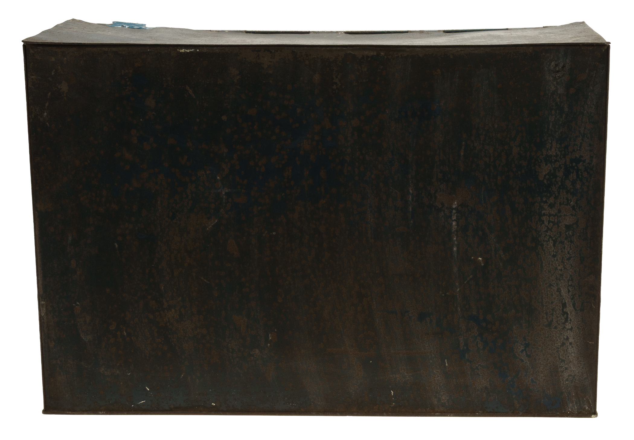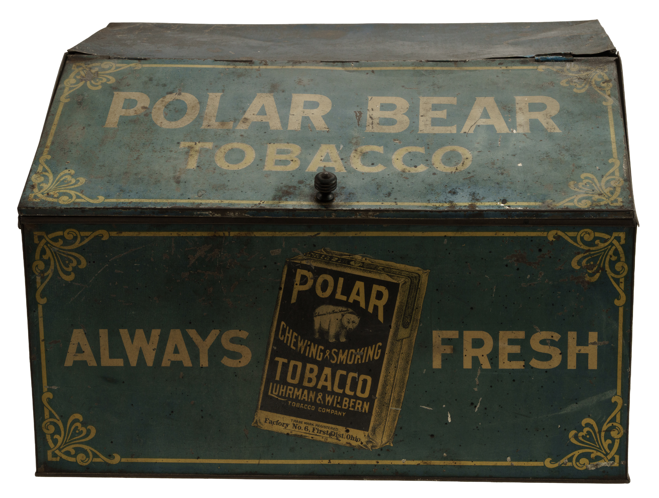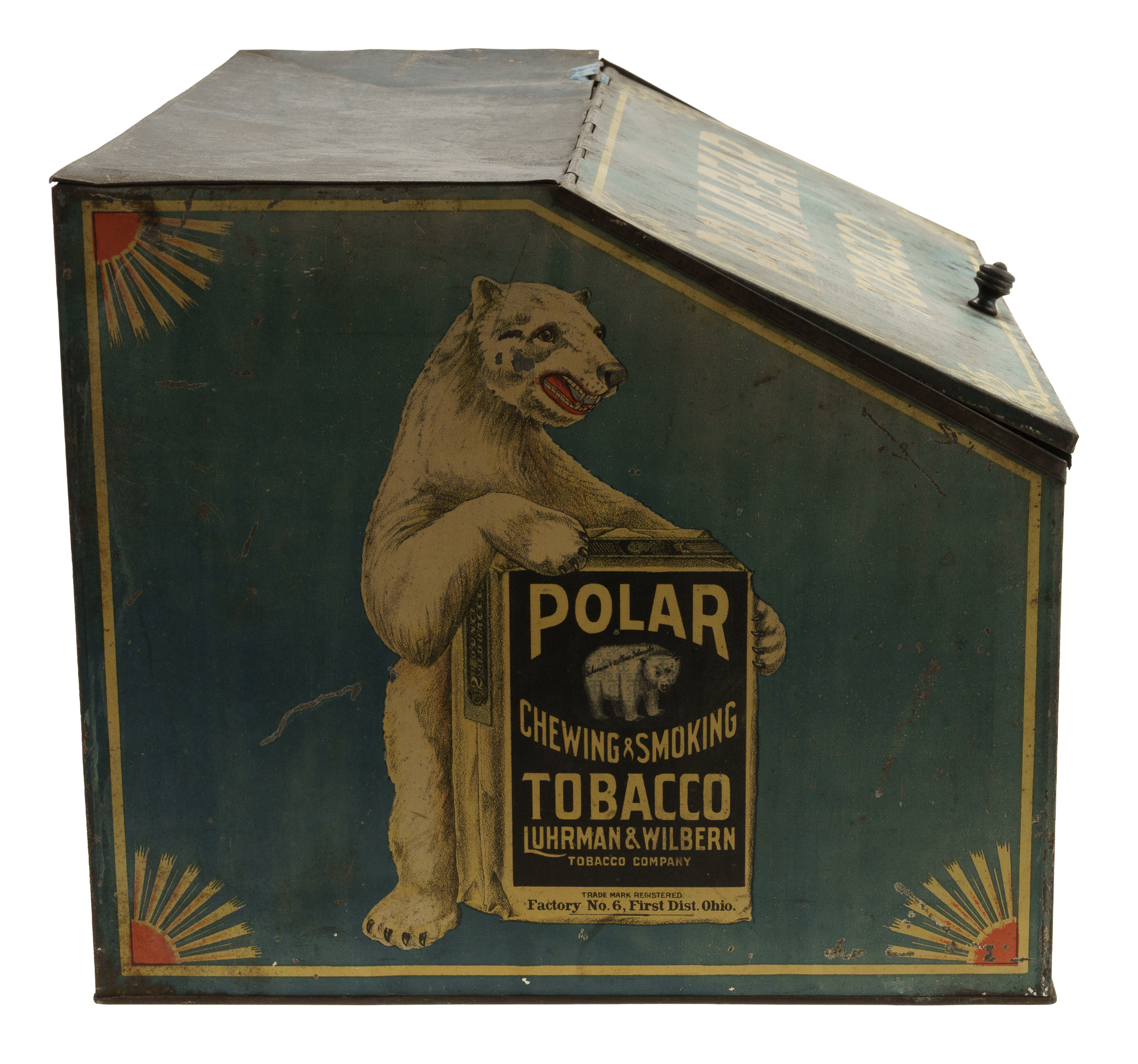 Rare tin display box, dating from the early 1900s, that once housed packages of "Polar Chewing and Smoking Tobacco." Each of the side panels features a color illustration of a polar bear holding a large package of Polar Tobacco. The hinged front lid is lettered "Polar Bear Tobacco," while the front panel reads "Always Fresh." An illustrated image of a Polar Tobacco package also appears on the front panel. While we have handled porcelain signs issued in promotion of this tobacco brand, this is just the second large retail tin display we have ever offered. The box (18 x 14 x 12 inches) displays heavy wear, including dents, abrasions, scratches, and areas of rusting and oxidation. There is color added to the top right hinge, which is detached. The interior chain is detached from its side mounting clasp but included. The size/weight of this item requires that there will be an additional shipping charge for this lot.