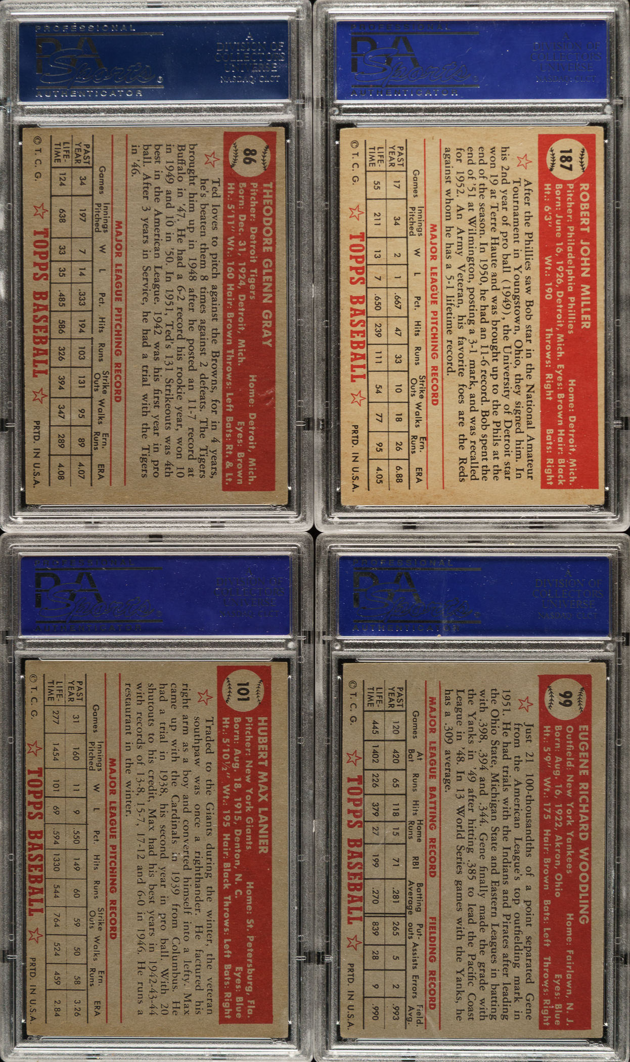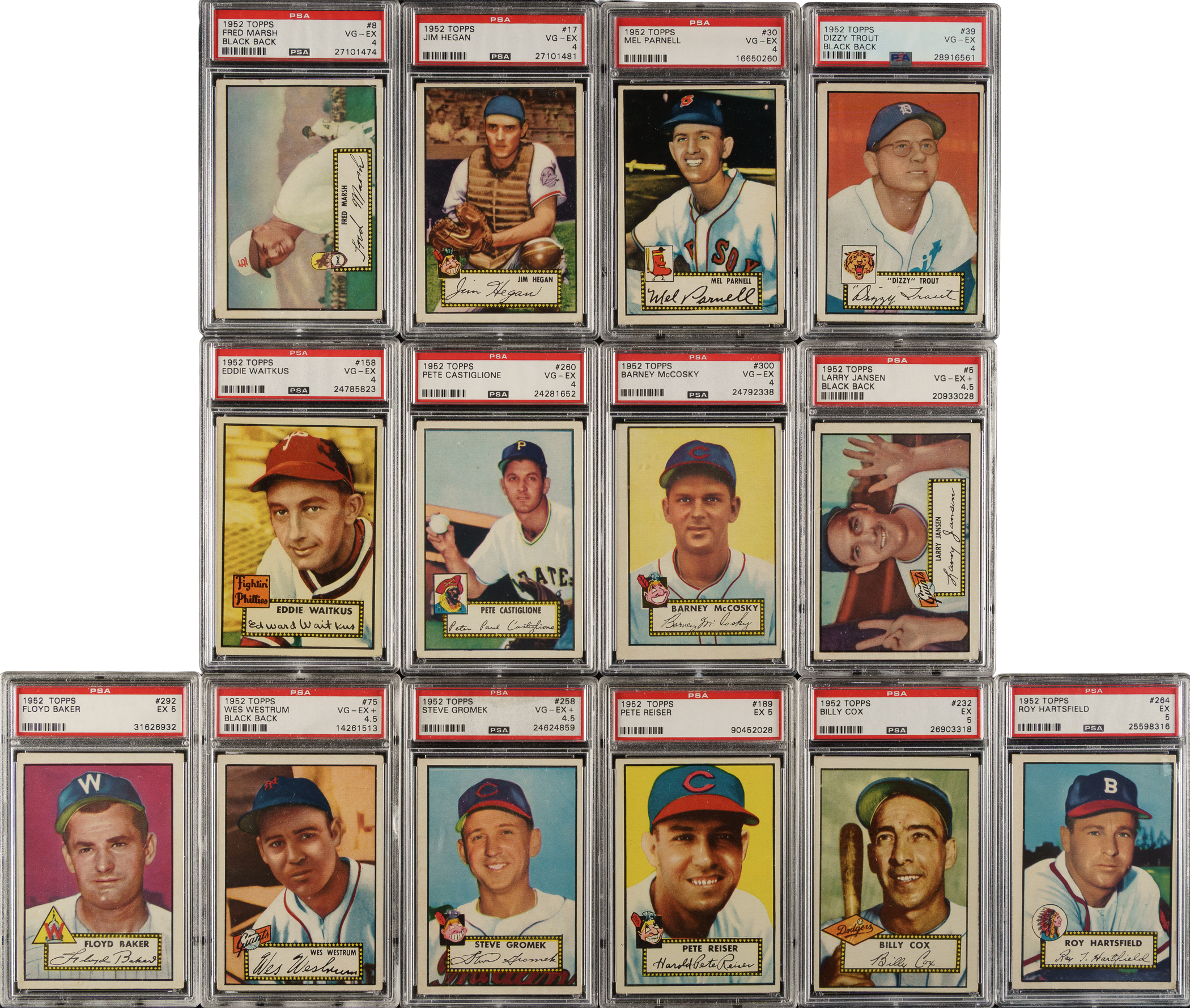Collection of eighteen 1952 Topps low-number baseball cards, each professionally graded and encapsulated by PSA. PSA Grading Composite: EX+ 5.5 (1 card): #86. EX 5 (7 cards): #99, 101, 187, 189, 232, 264, and 292. VG-EX+ 4.5 (3 cards): #5 (black back), 75 (black back), and 258. VG-EX 4 (7 cards): #8 (black back), 17, 30, 39 (black back), 158, 260, and 300. Total: 18 cards.