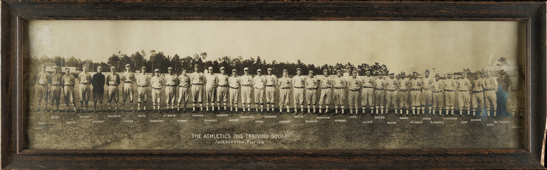 This large panoramic photograph captures 38 members of the 1915 Philadelphia Athletics posing together during spring training in Jacksonville, Florida, including Hall of Famers Nap Lajoie (in his first season with the team at age 40) and Herb Pennock. Other notable players pictured include Amos Strunk, Wally Schang, Jack Lapp, Stuffy McGinnis, Weldon Wyckoff, and Stuffy McGinnis. The panorama (35 x 9.25 inches; visible dimensions), which has exceptional clarity, has spots of discoloration along the outer edges, while the central image area remains mostly unaffected. Framed to total dimensions of 36 x 11 inches. The size/weight of this item requires that there will be an additional shipping charge for this lot.