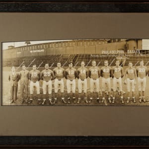 Panoramic photograph featuring 21 members of the 1935 Philadelphia Eagles. The players are pictured posing shoulder to shoulder on the field, with each player identified in print upon his image, including Joe Carter, Swede Hanson, Ed Matesic, Ed Storm, and Jim Leonard. The text "Philadelphia Eagles/National League Football 1935 Season/Lud Wray, Coach/Bert Bell, Pres." is printed in white and centered. The photographer's credit, "Weintraub," appears in white lettering in the lower left corner. Under the stewardship of founding owner and future league commissioner Bert Bell, the Philadelphia Eagles finished the 1935 season 2-9. The photo (27 x 7 inches; visible dimensions) displays creasing and a few tiny spots of surface loss. Matted and framed to total dimensions of 36 x 16 inches. The size/weight of this item requires that there will be an additional shipping charge for this lot.