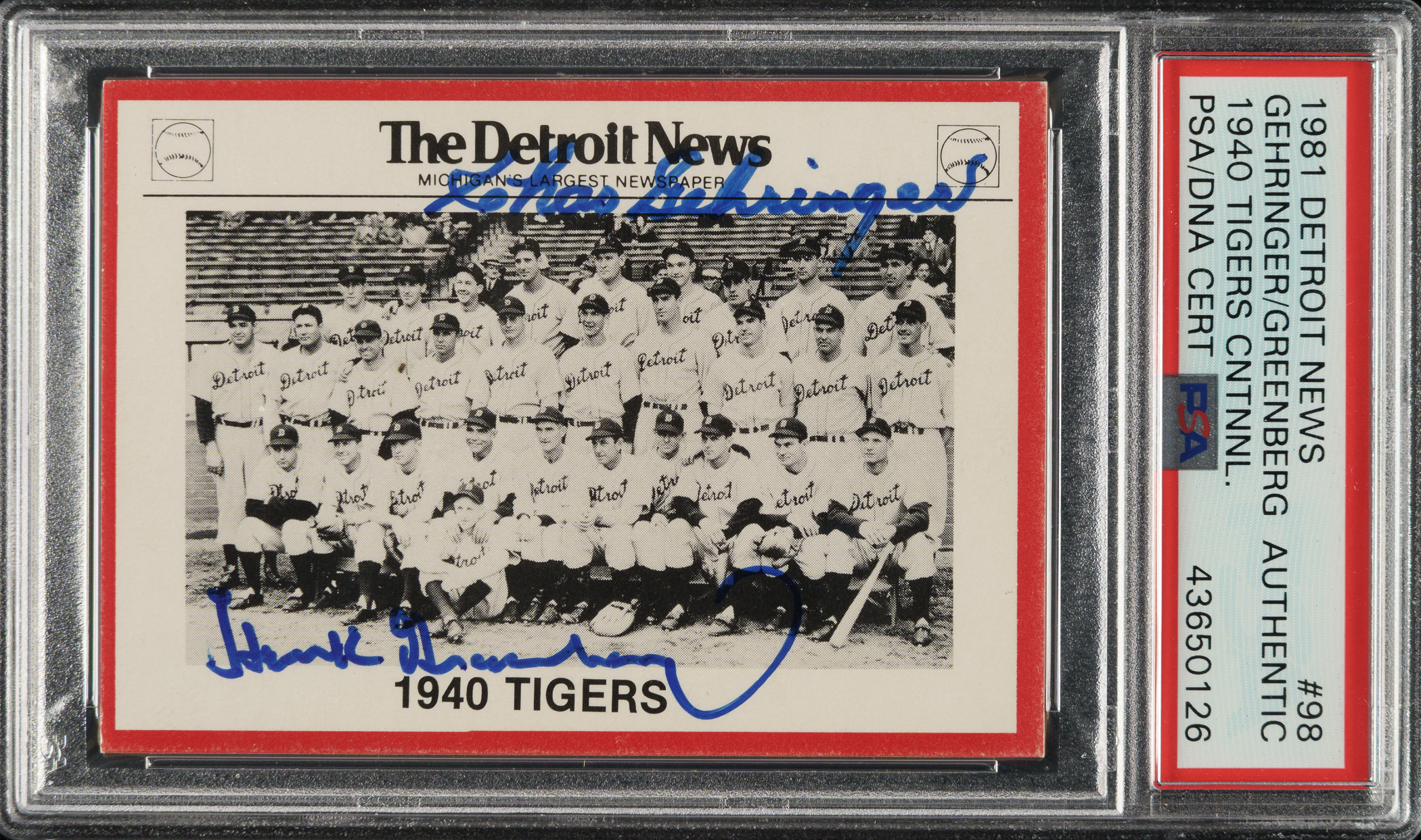 PSA/DNA has encapsulated the card, grading the signatures Authentic. Detroit Tigers Hall of Famers Charles Gehringer and Hank Greenberg.