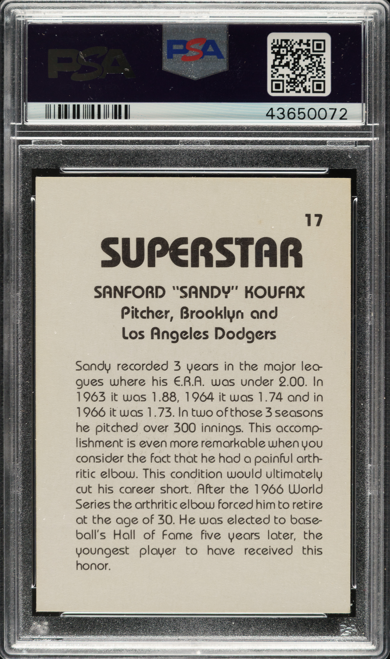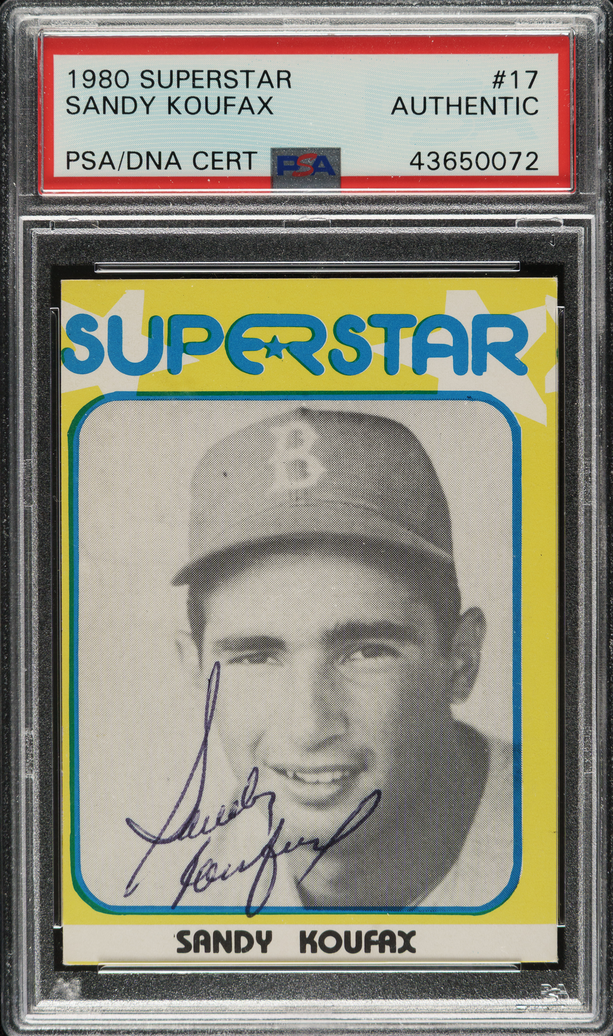 PSA/DNA has encapsulated the card, grading the signature Authentic. Brooklyn Dodgers Hall of Famer Sandy Koufax.