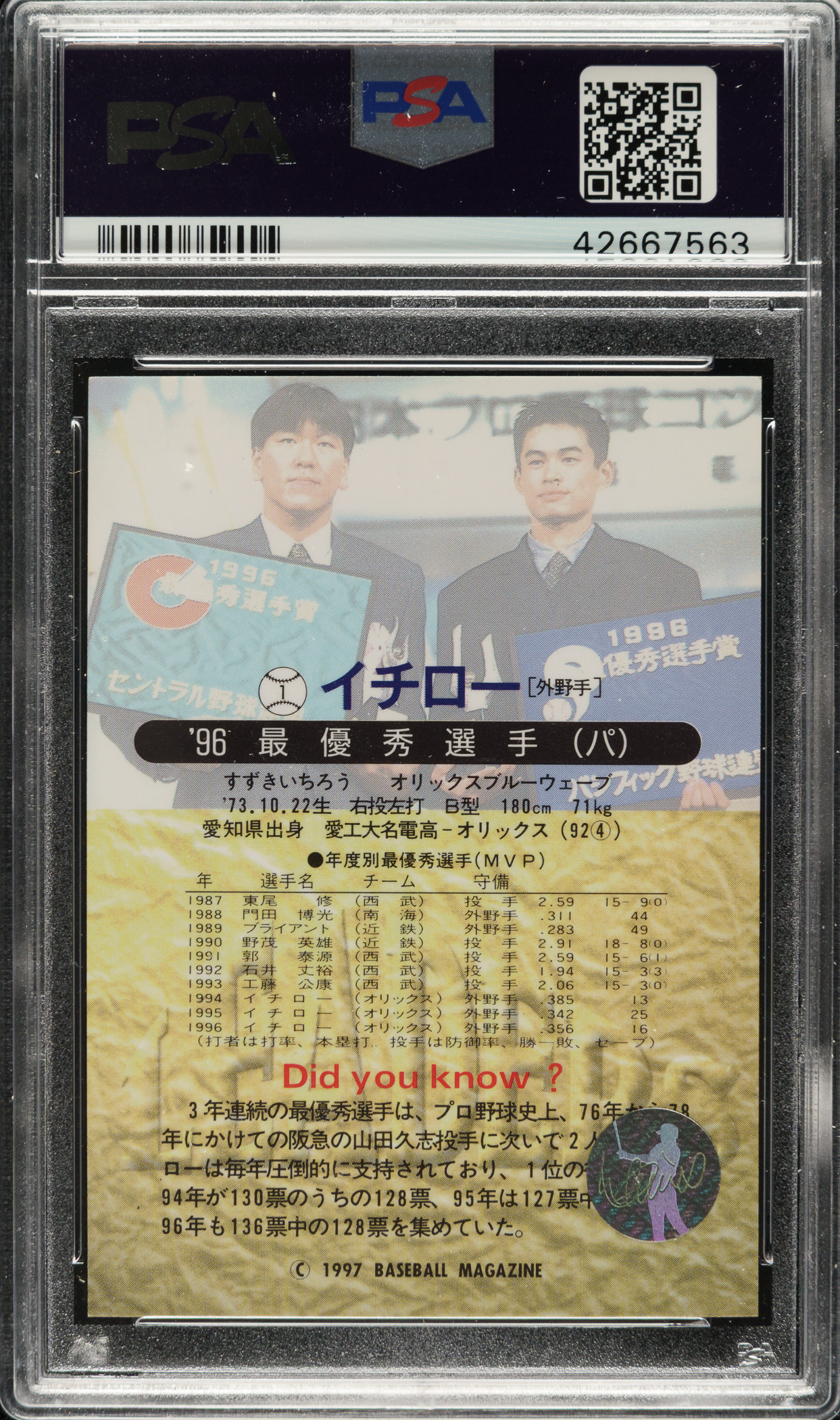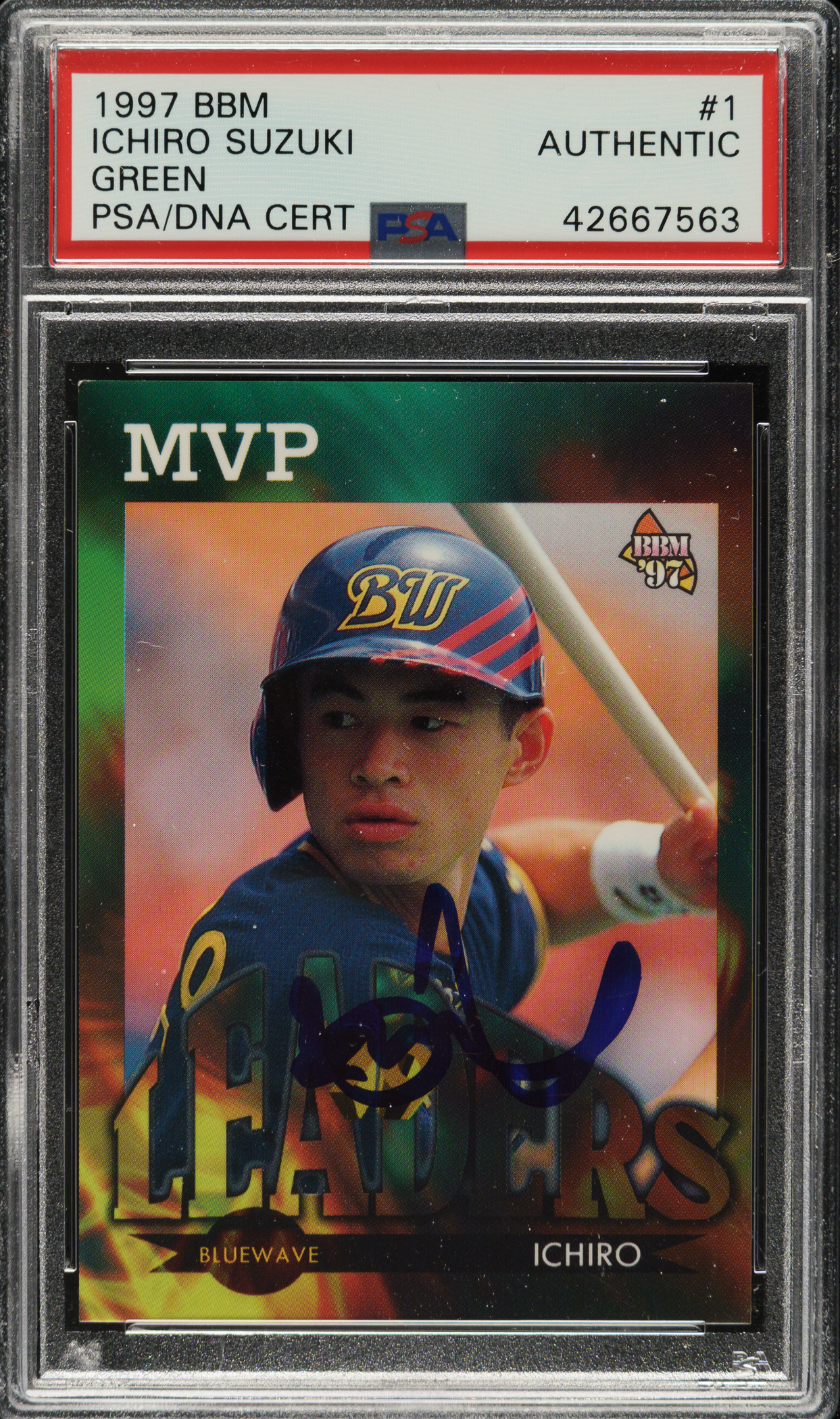 PSA/DNA has encapsulated the card, grading the signature Authentic. Orix Blue Wave Hall of Famer Ichiro Suzuki.