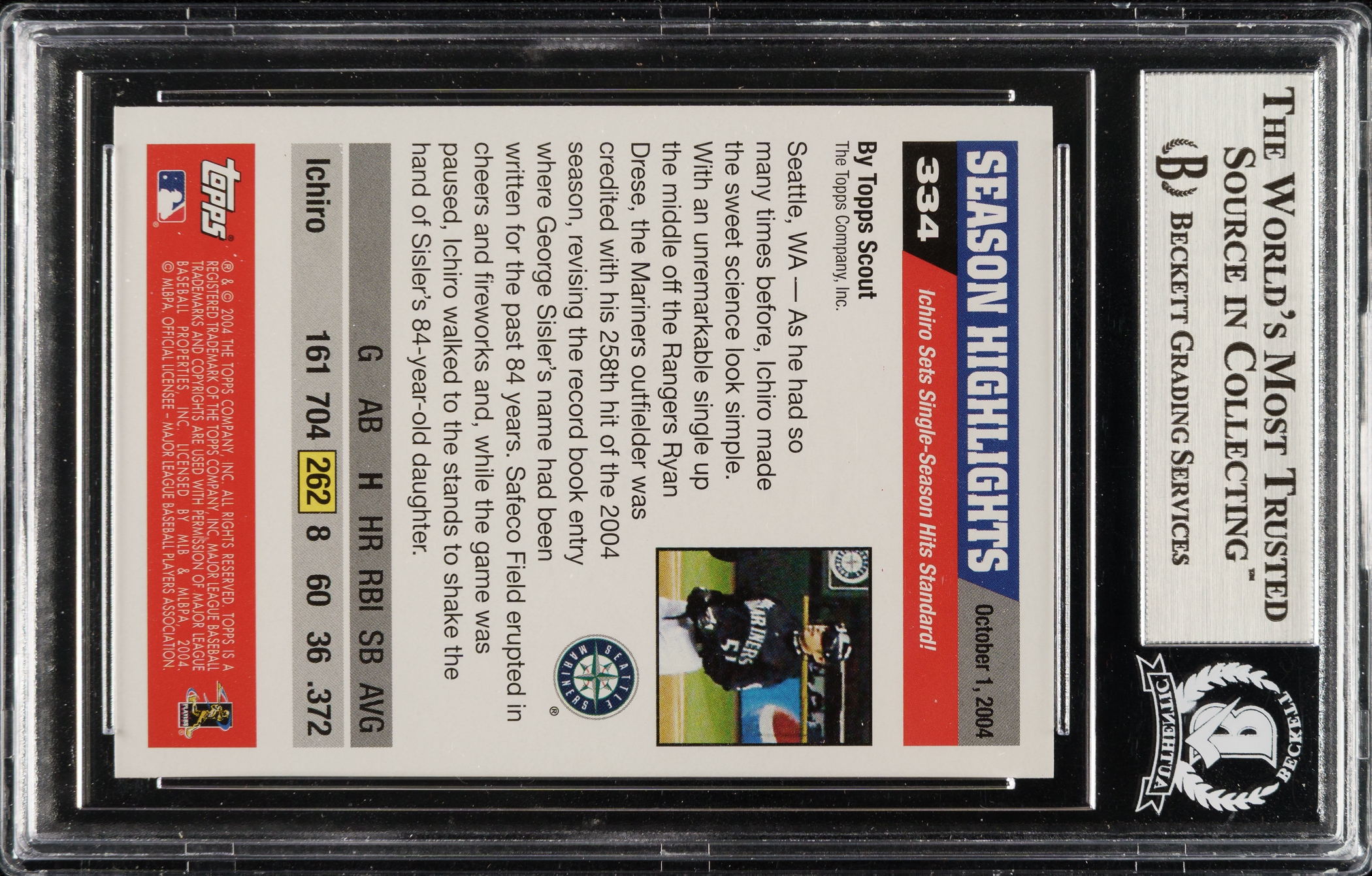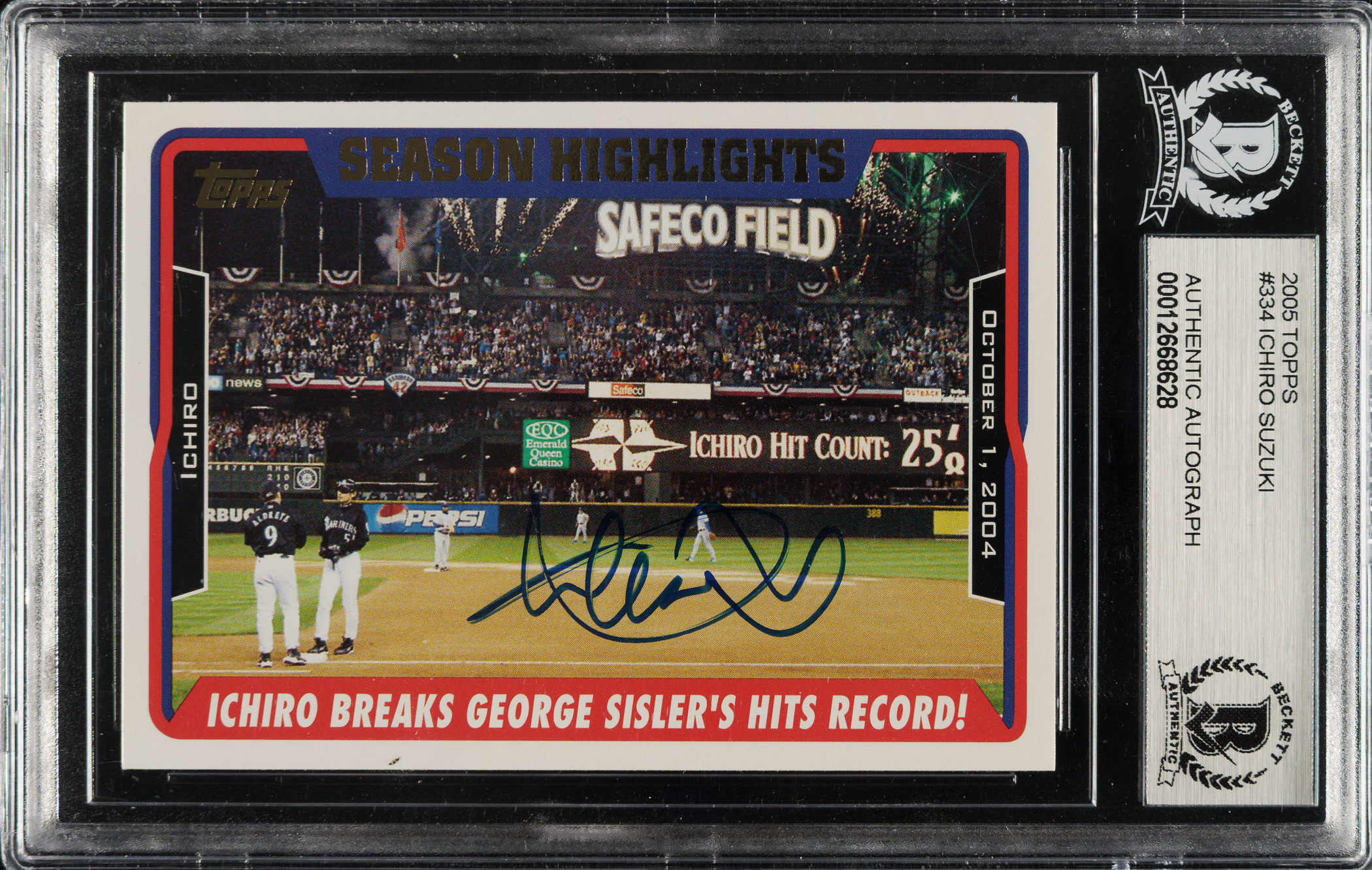 Beckett has encapsulated the card, grading the signature Authentic. Seattle Mariners Hall of Famer Ichiro Suzuki.