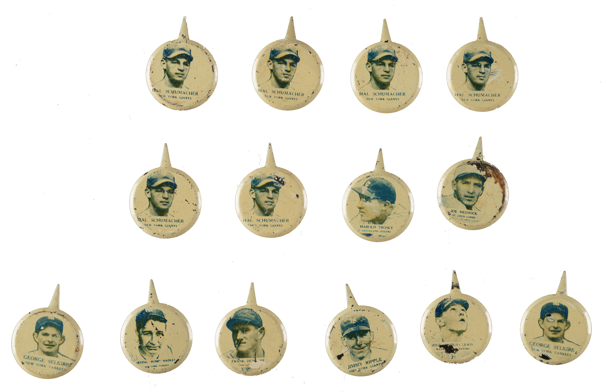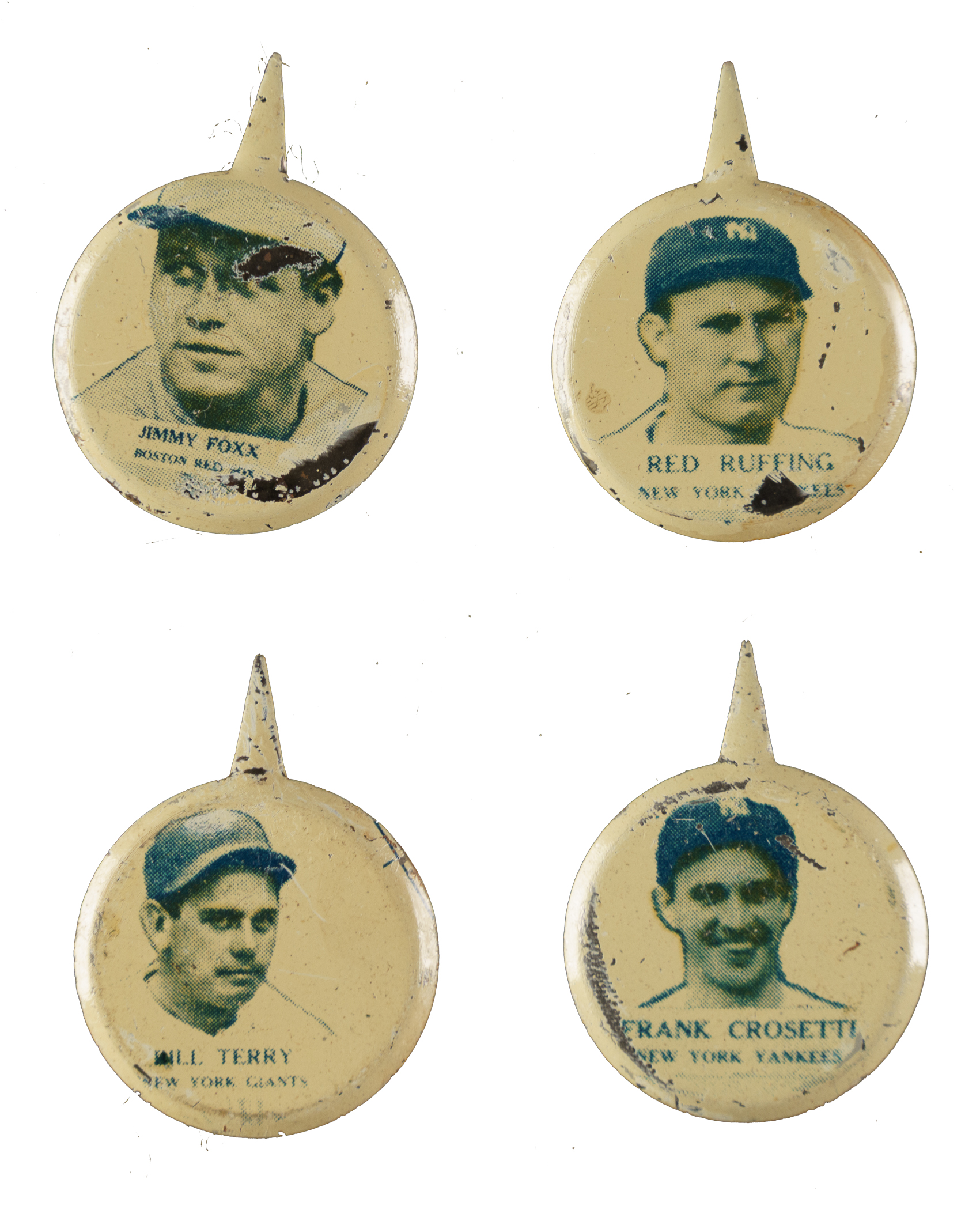 Collection of eighteen 1938 PM8 Our National Game Pins, highlighted by Hall of Famers Jimmy Foxx, Joe Medwick, and Bill Terry. This series was issued in 1938 and is referred to as "Our National Game," based on the name printed along the top of the original cardboard backings on which they were sold. Each pin, which measures 7/8 inches in diameter and features a player portrait, has a bendable "tab" rather than a pin back. Printed in blue and white with the respective player's name and team below his image. Condition ranges from Pr-Fr to Vg-Ex (averaging Gd+). This collection consists of the following: Crosetti, Demaree, Foxx (HOF, Pr-Fr), Hadley, Lewis, Medwick (HOF, Pr-Fr), Ripple, Ruffing (HOF, Fr), six Schumacher, two Selkirk, Terry (HOF, Vg+), and Trosky. Total: 18 cards.
