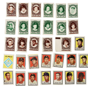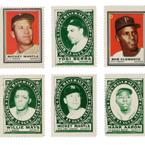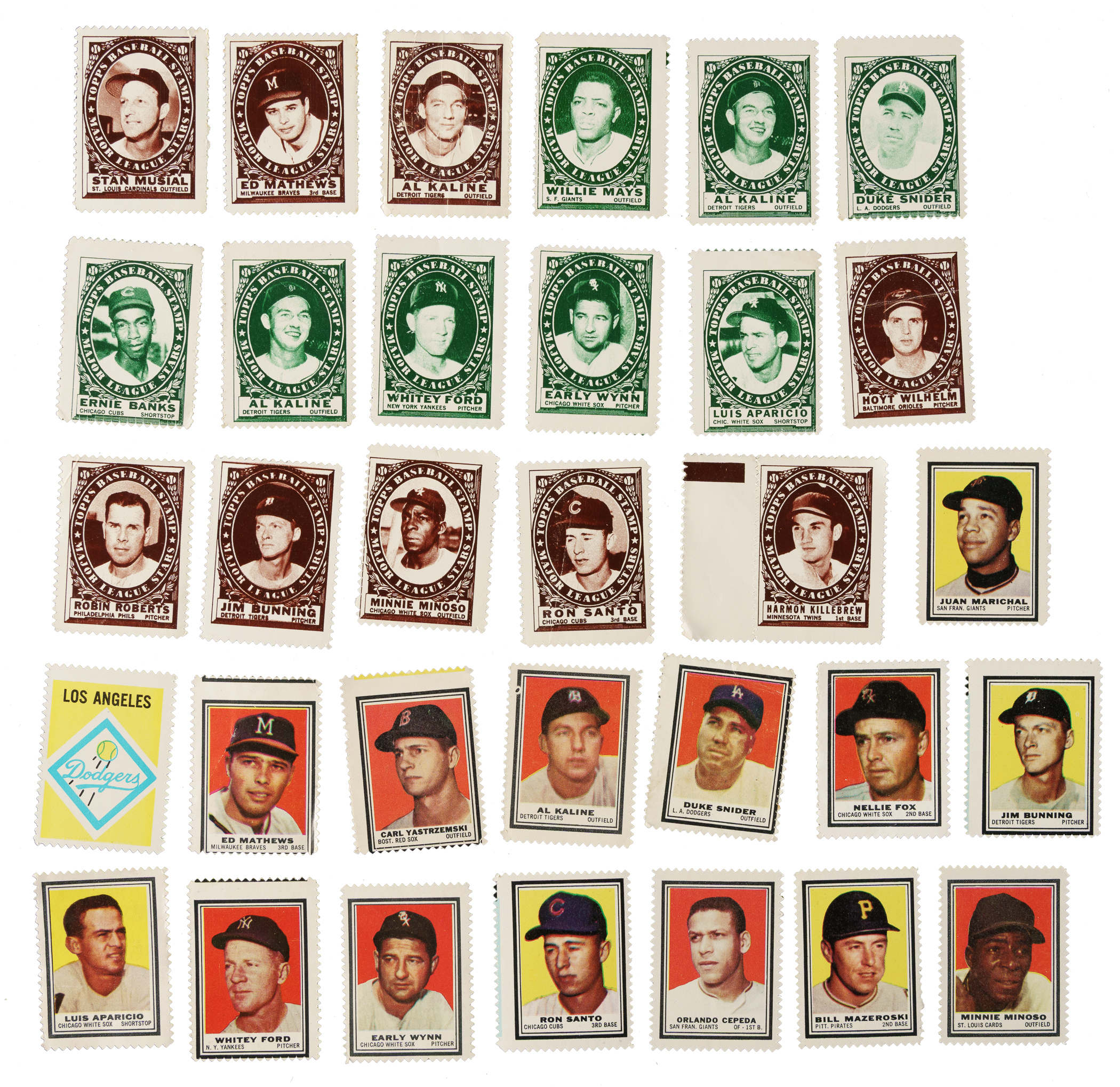 Presented is a collection of 1961 and 1962 Topps Stamps. These "cards" are actually stamps that were two-player panels inserted into wax packs of 1961 and 1962 Topps baseball cards (this collection includes eleven intact panels). The 1961 stamps were designed featuring a colorized image (either brown or green) of the player, his name, team, and position. The 1962 stamps were designed in color with the image of the player, his name, team, and position. The stamps featured in this collection include thirty-eight Hall of Famers, as well as numerous stars, highlighted by Mickey Mantle, Hank Aaron, Willie Mays, and Roberto Clemente. This collection consists of the following: 1) 1961 (176 stamps): Condition is 6% Nr/Mt or better, 28% Ex to Ex-Mt, 52% Vg to Vg-Ex, and 14% lesser. Includes four intact two-player panels (included individually in the count). Keys: Aaron (Fr), Banks (Gd), Berra (Vg+), Ford (Vg), three Kaline (Vg-Ex+, Vg, and Pr-Fr), Killebrew (Vg, with tab attached on left), Mantle (Ex-Mt+), Mathews (Vg), two Mays (Vg due mostly to centering and Gd), Musial (Fr-Gd), and Snider (100/0 T/B, otherwise Vg-Ex). 2) 1962 (144 stamps): Condition is 17% Nr/Mt or better, 32% Ex to Ex-Mt, 41% Vg to Vg-Ex, and 10% lesser (including one trimmed).Includes seven intact two-player panels (included individually in the count). Keys: Clemente (Gd), Ford (Gd), Kaline (Ex),Mantle (Vg), Mathews (Fr), Snider (Fr), and Yastrzemski (100/0 T/B, otherwise Ex). A very attractive collection of these unusual and rarely offered Topps insert stamps. Total: 320 stamps.