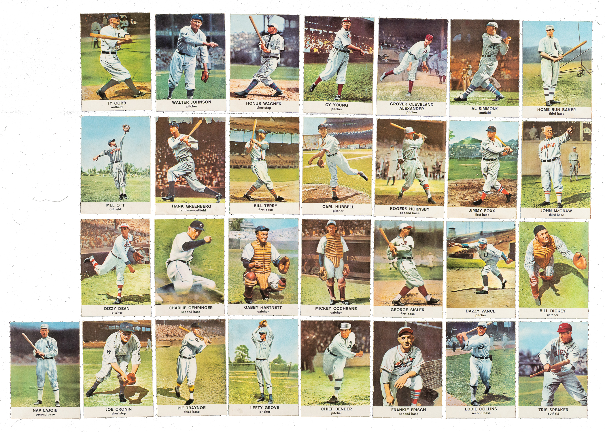 Offered is a very attractive mid- to high-grade complete set of 1961 Golden Press cards. This classic set features all the great stars of the game, including legendary Hall of Famers Babe Ruth, Lou Gehrig, Joe DiMaggio, Ty Cobb, Cy Young, and Walter Johnson. This issue is very substantial and interesting, yet is somewhat overlooked in the card-collecting world. Golden Press spared no expense in producing a beautiful set of cards featuring Hall of Famers. For years these sets were sold at souvenir shops in Cooperstown. Looking at the quality and design of the set, it is easy to appreciate its enormous aesthetic appeal both to youngsters in the 1960s and to modern vintage-card collectors that are familiar with the set. Condition is 18% Nr/Mt, 57% Ex to Ex-Mt, and 25% Vg to Vg-Ex (including one lesser). Keys: #3 Ruth (Ex), 9 DiMaggio (Vg+), 16 Gehrig (Ex-Mt), 24 Mathewson (Ex-Mt), 25 Cobb (Nr/Mt+), 29 Johnson (Ex+), 32 Wagner (Ex-Mt+), and 33 Young (Ex+). Total: 33 cards.