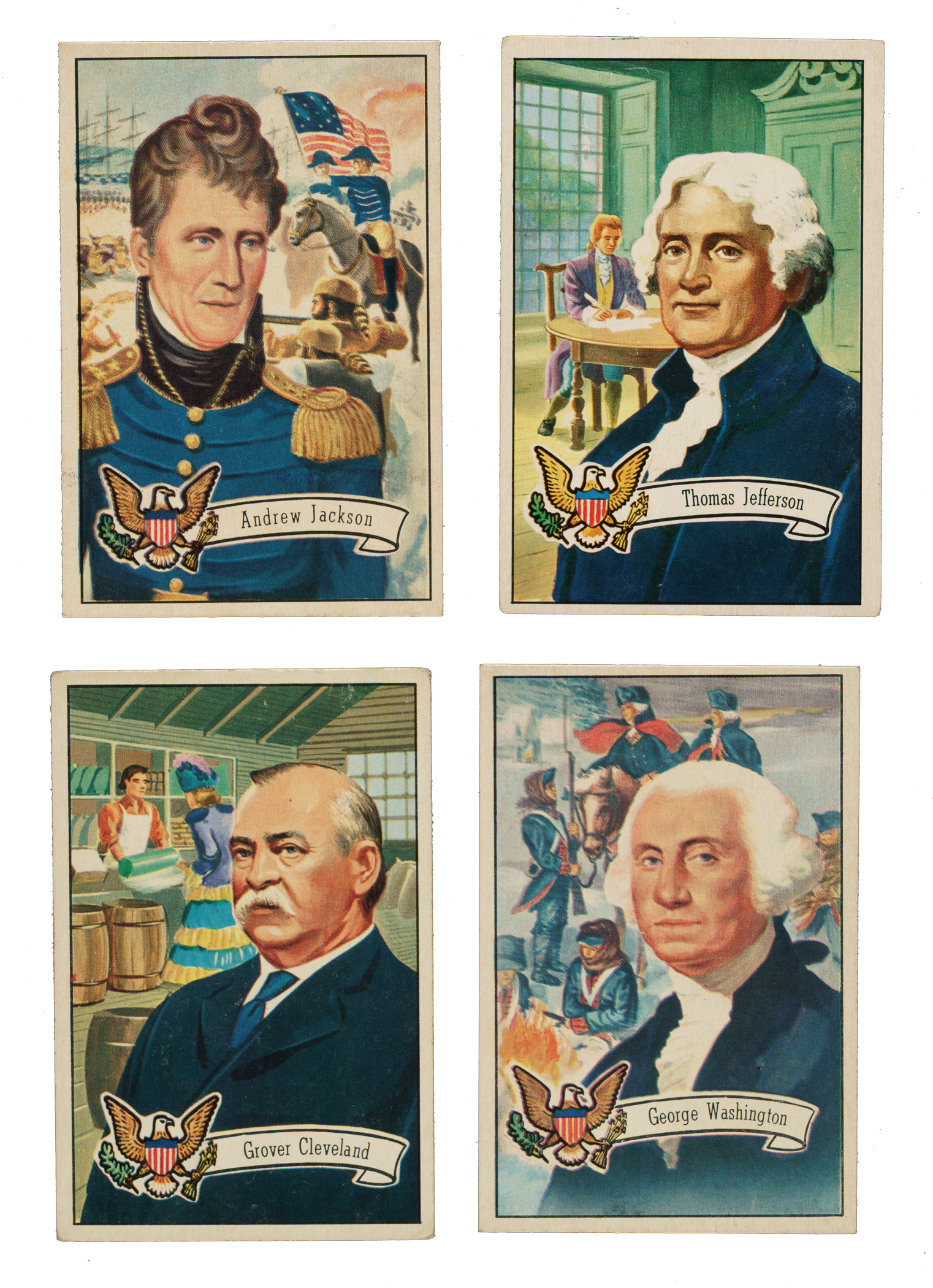 Complete set of 1952 Bowman "U.S. Presidents" cards. Condition is 13% Ex or slightly better, 48% Vg to Vg-Ex, and 39% lesser (including one that measures small). Total: 36 cards.