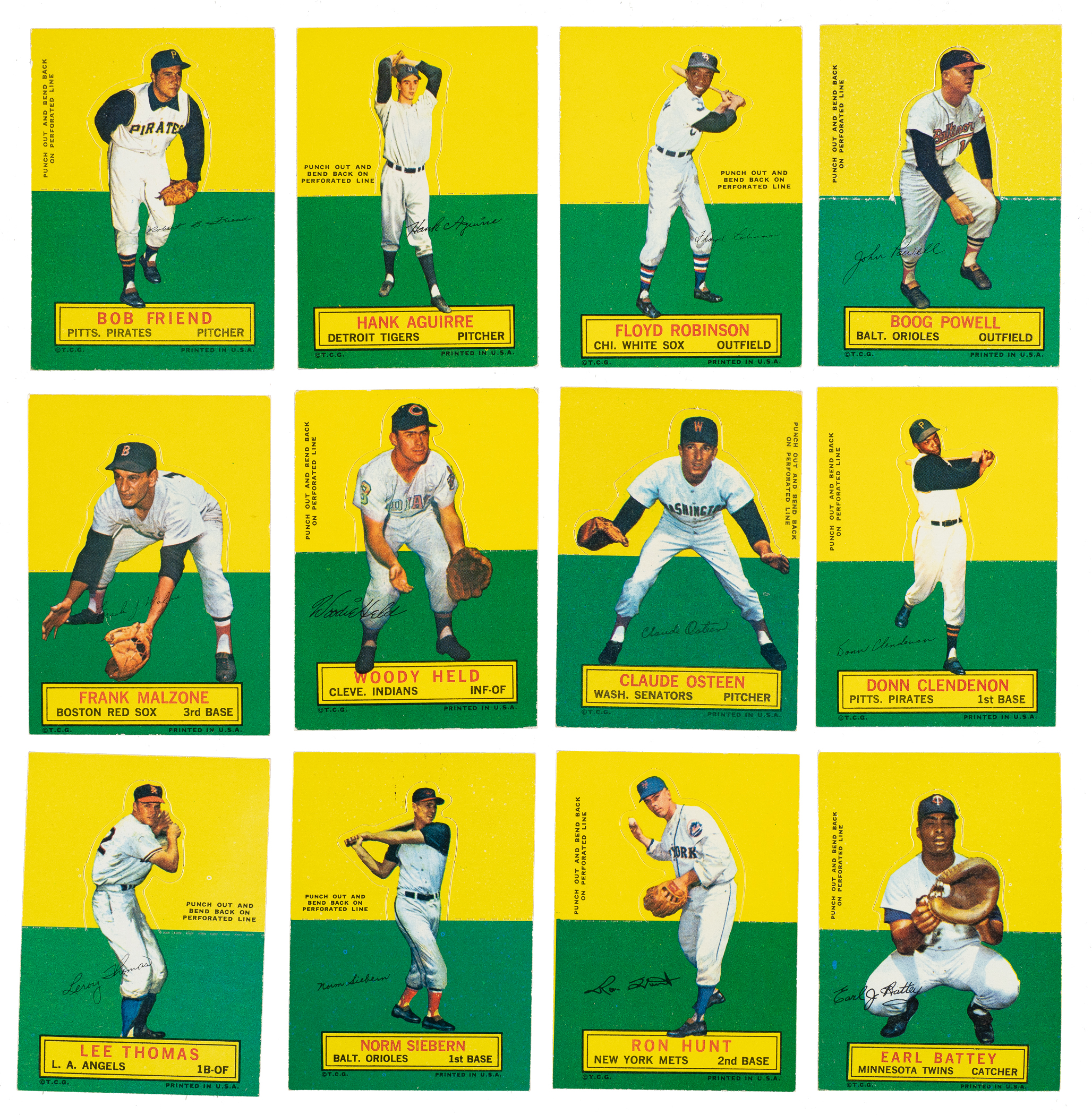 Collection of twelve different 1964 Topps Stand-Ups. Condition ranges from Vg-Ex to Ex-Mt (averaging Ex), with one Vg. This collection consists of the following: Aguirre, Battey, Clendenon, Friend, Held, Hunt, Malzone, Osteen, Powell, Fl. Robinson, Siebern, and Thomas. Total: 12 cards.