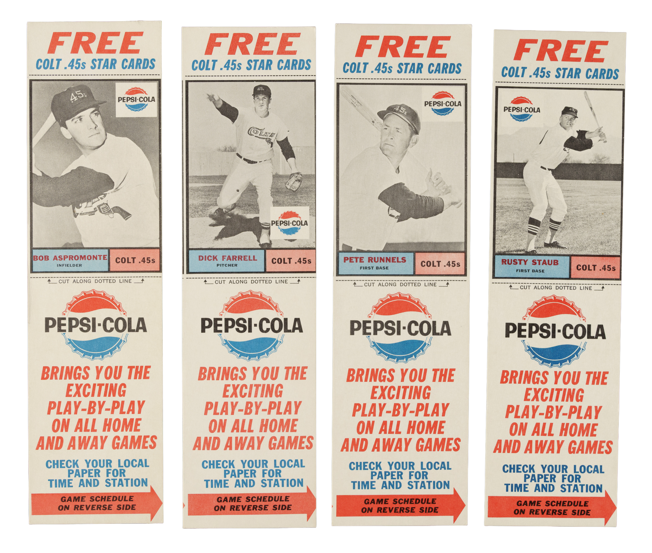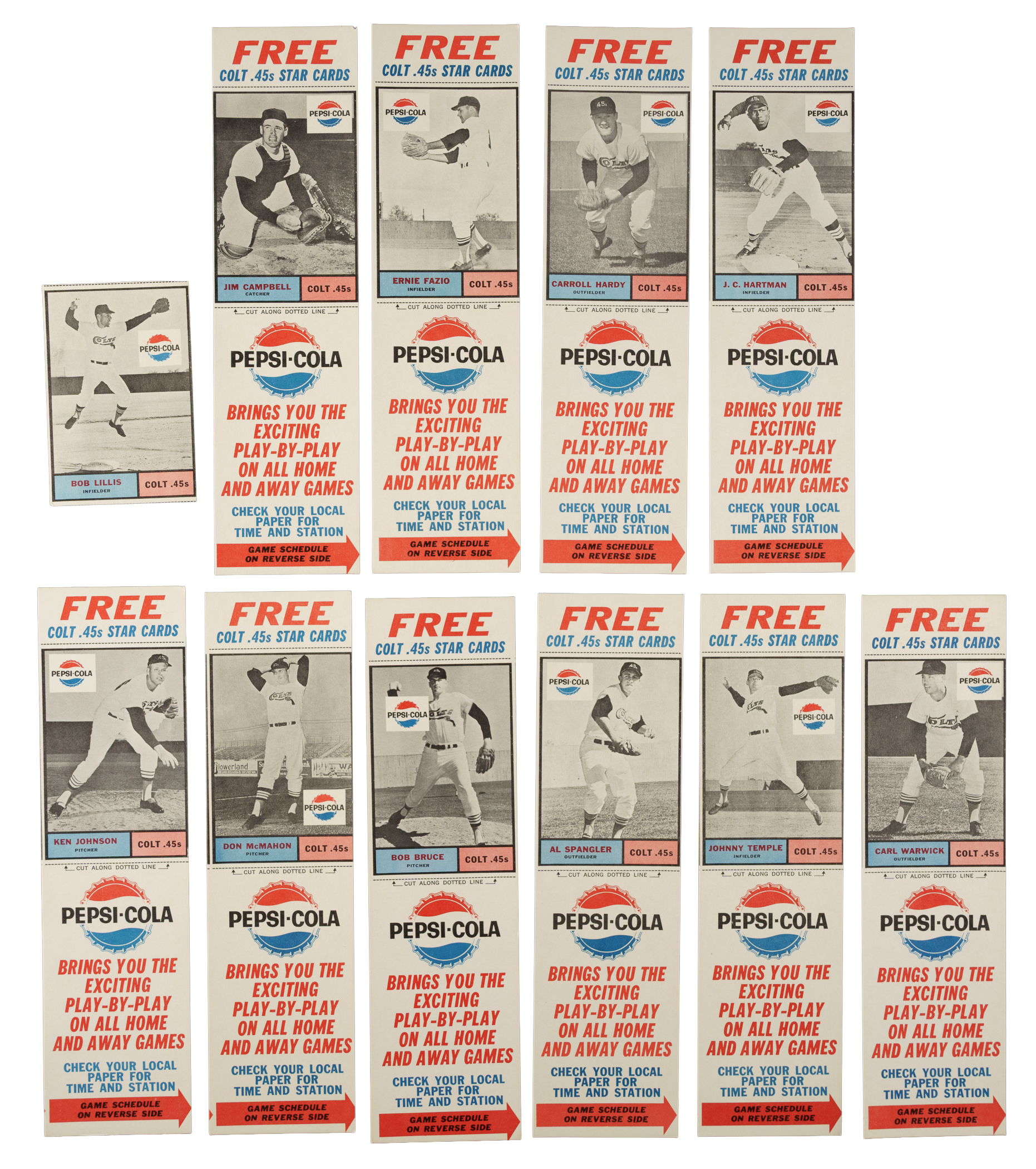 Near-complete set (14/16) of 1963 Pepsi-Cola Houston Colt .45's. Missing just two cards for completion: Bateman and Bruce. All cards are complete with tabs except for one (Lillis). Condition ranges from Vg to Ex (averaging Vg-Ex), with a couple slightly lesser. Includes several cards with 100/0 centering, a common characteristic of this issue. Total: 14 cards.