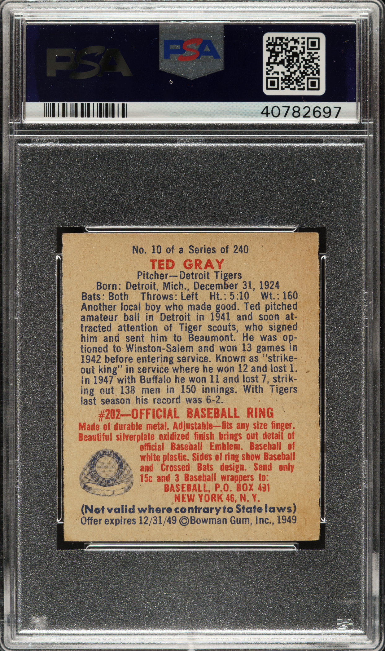 Lot # 1289: 1949 Bowman #10 Ted Gray PSA NM-MT+ 8.5