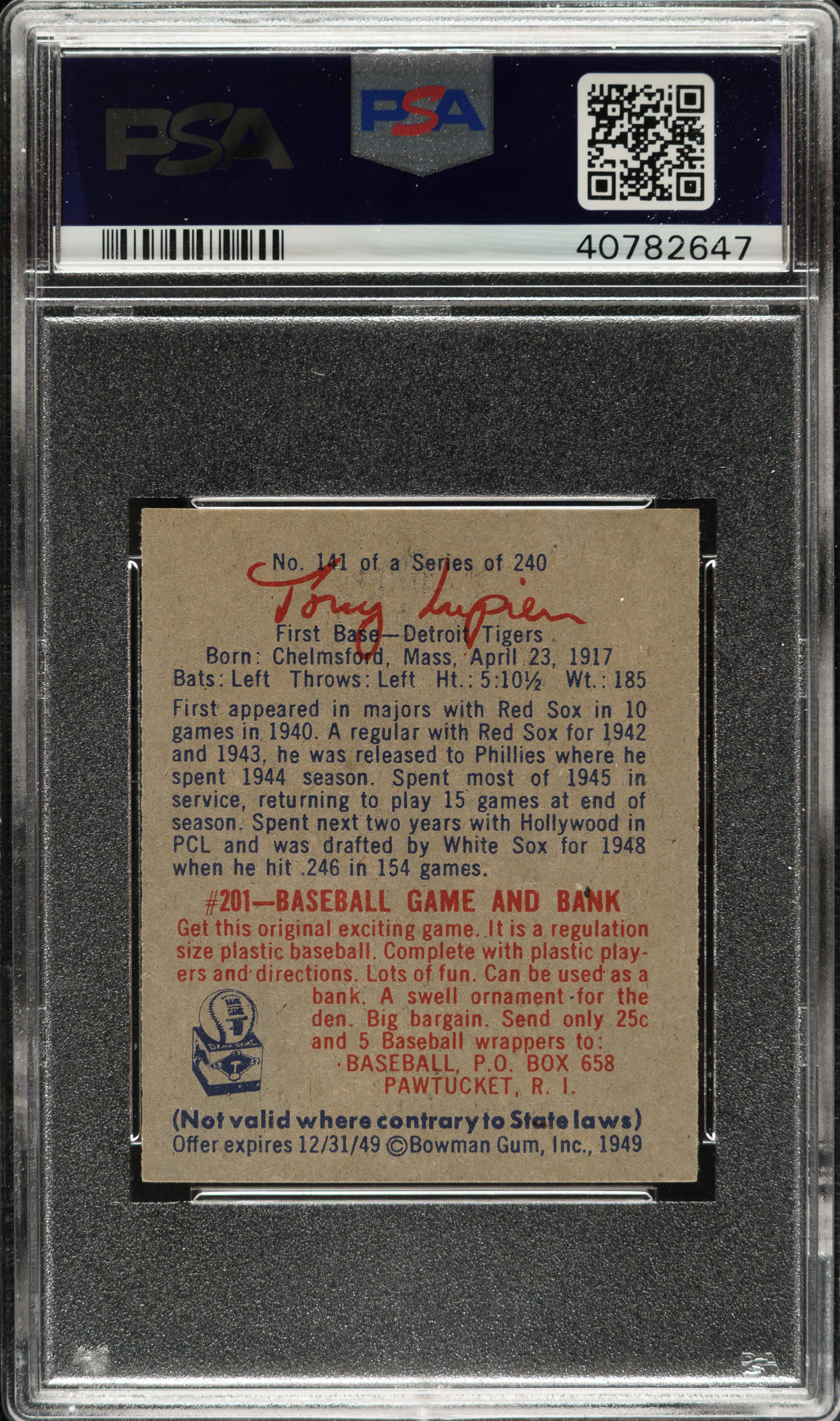 Lot # 1294: 1949 Bowman #141 Ulysses Lupien PSA NM-MT 8