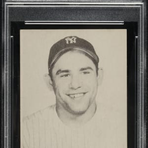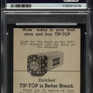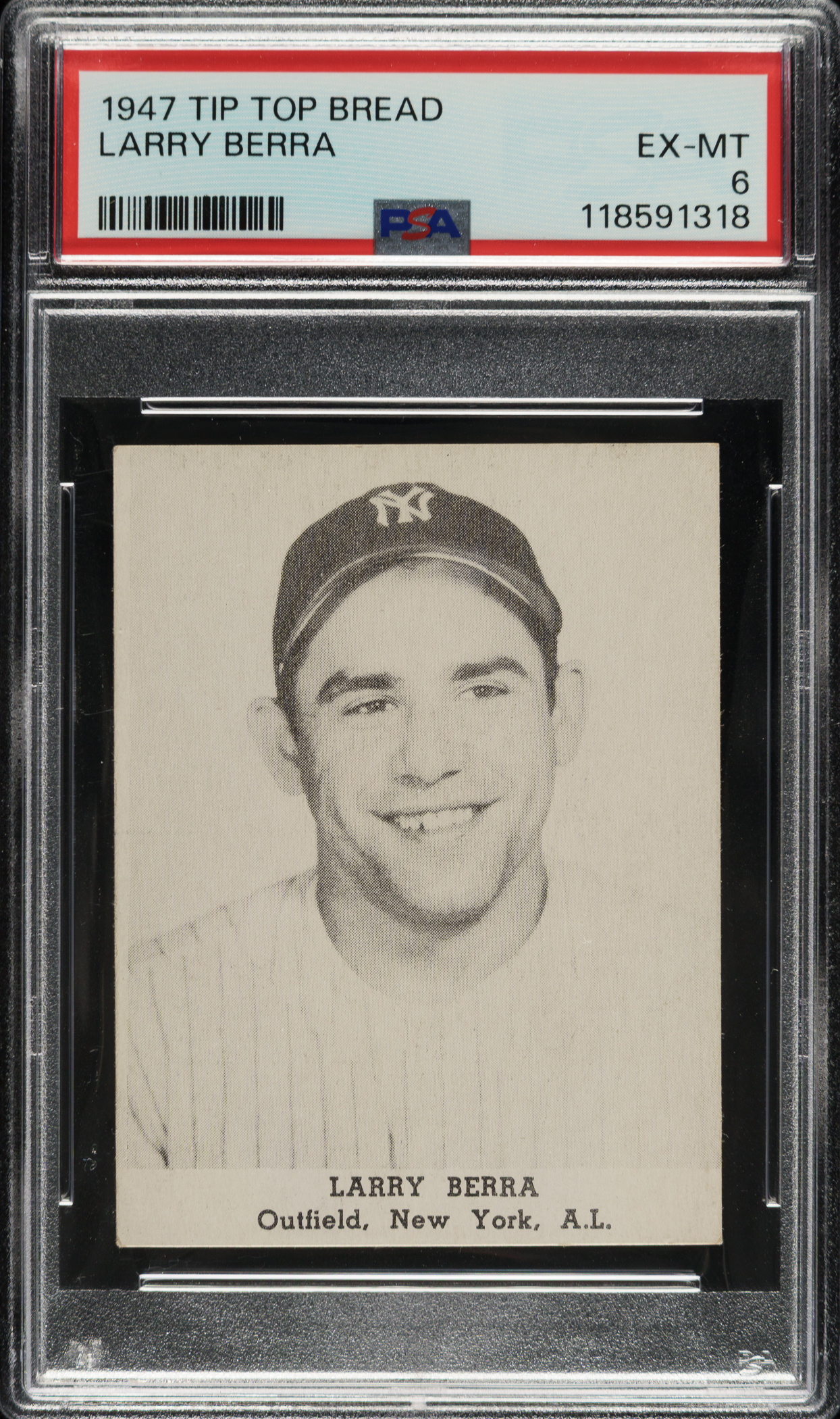 Graded EX-MT 6 by PSA (submitted by REA). One of only six examples graded at this level with just two higher. Extremely attractive example of Yogi Berra's rookie card from the scarce 1947 D323 Tip Top Bread set. Bright and crisp, both front and back, with strong corners with light wear. The reverse has bold black text. This is an outstanding example of the undisputed rookie card of Berra! Due to their method issue (one per loaf of bread), Tip Top Bread cards generally are not found in high grade. Berra went on to win three MVP awards and was named to 15 All-Star teams, but when this card was issued he was at the very beginning of his spectacular career, which included 14 World Series appearances and lasted well into the mid-1960s. This is a superb example of Berra's first card from this scarce regional set.