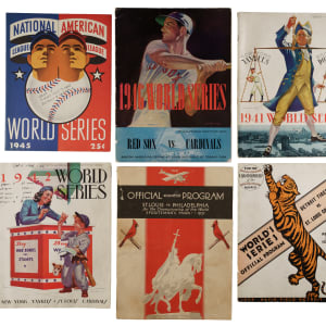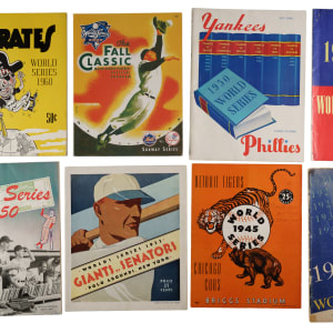 Presented is a tremendous collection of World Series programs issued between the years 1931 and 2024 (99 programs). It should be noted that up until 1973 each club issued its own World Series program; In 1974, Major League Baseball began producing a single official program for the entire Series. This is a near-complete run, featuring at least one official program from every World Series during that more than 90-year span (missing only 1932 and 1943), along with an example issued by each club for the following years: 1938, 1945, 1946, 1950, 1951, 1957, and 1964. Also included is one duplicate 1951 Giants. The following 15 programs are scored: 1933, 1936, 1938 (both of them), 1944, 1945, 1947, 1949, 1950 (one is scored, one is not), 1952, 1955, 1956, 1957 (both of them), and 1964 (one scored, one is not). This collection consists of the following: 1931: Cardinals (Fr); 1933: Giants (Vg); 1934: Tigers (Fr); 1935: Tigers (Pr); 1936: Giants (Fr); 1937: Yankees (Gd); 1938: Yankees (Fr with one interior scoring page detached), Cubs (Fr); 1939: Reds (Gd); 1940: Tigers (Vg); 1941: Yankees (Fr-Gd); 1942: Yankees (Fr); 1944: Browns (Fr); 1945: Tigers (Fr), Cubs (Fr); 1946: Cardinals (Fr), Red Sox (Gd); 1947: Yankees (Pr); 1948: Braves (Pr); 1949: Yankees (Pr); 1950: Yankees (Vg), Phillies (large hole on back cover, otherwise Vg); 1951: Yankees (Gd), two Giants (Vg and Pr); 1952: Yankees (Gd); 1953: Dodgers (Gd); 1954: Indians (Vg-Ex); 1955: Yankees (Fr); 1956: Dodgers (Gd); 1957: Braves (pencil writing on front cover, otherwise Vg-Ex), Yankees (Gd-Vg); 1958: Yankees (Vg-Ex); 1959: Dodgers (Vg-Ex); 1960: Pirates (Gd); 1961: Reds (Pr); 1962: Yankees (Fr); 1963: Dodgers (Gd); 1964: Yankees (Vg), Cardinals (Vg); 1965: Dodgers (Pr); 1966: Orioles (Ex); 1967: Red Sox (Ex-Mt); 1968: Cardinals (Vg); 1969: Orioles (Vg); 1970: Orioles (Vg); 1971: Orioles (Vg-Ex); 1972: Reds (Vg); 1973: Mets (Vg). Most of these programs are technically in medium to lower-grade (as is often the case with vintage World Series programs), but are extremely presentable. The programs spanning the years 1974 to 2024 range in grade from Very Good to Near Mint, averaging Excellent. This is a very substantial and fairly comprehensive World Series program collection, spanning the years 1931 to 2024. Total: 99 programs. The size/weight of this item requires that there will be an additional shipping charge for this lot.