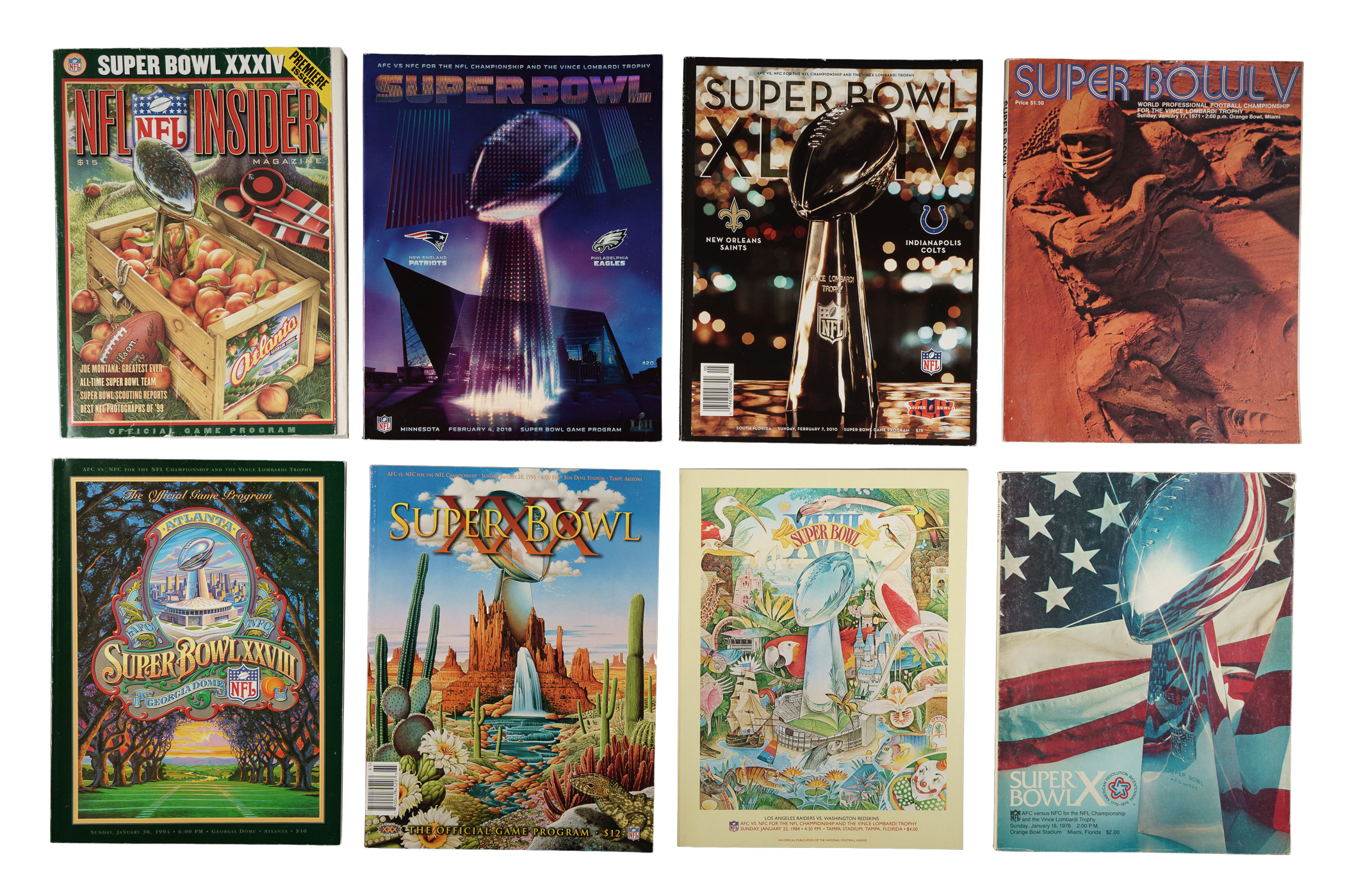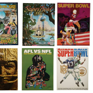 Presented is an impressive complete run of 59 different Super Bowl programs beginning with Super Bowl I in 1967 through Super Bowl LIX in 2025. This is the largest run of Super Bowl programs we have ever offered! The first five issues grade as follows: 1) Super Bowl 1: Gd with creases on both covers and a few scattered ink marks on the back cover. 2) Super Bowl II: Vg with light creases on both covers. 3) Super Bowl III (Collector's Edition): Fr with light creases on both covers, a staple hole on the front cover, and the interior pages slightly separated from spine (but remain intact). 4) Super Bowl IV: Ex with normal handling wear. 5) Super Bowl V: Gd with light creases on both covers and a small tear on the back cover. The remainder of the programs range from Vg to Nr/Mt condition (with a few lesser), averaging Excellent. Total: 59 programs. The size/weight of this item requires that there will be an additional shipping charge for this lot.