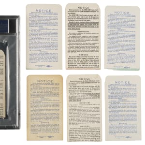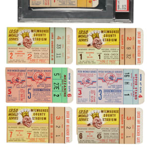Complete collection of all seven 1958 World Series Ticket stubs. The Yankees defeated the Braves in seven games, avenging the previous season's World Series loss to Milwaukee All of the ticket stubs measure roughly 4.25 x 2.25 inches. The collection consists of the following: 1) Game 1 at Milwaukee County Stadium (Gd). 2) Game 2 at Milwaukee County Stadium (Fr). 3) Game 3 at Yankee Stadium (Fr). 4) Game 4 at Yankee Stadium. Graded GOOD 2 by PSA. 5) Game 5 at Yankee Stadium (Fr with blue ink notations on the front). 6) Game 6 at Milwaukee County Stadium (Fr). 7) Game 7 at Milwaukee County Stadium (Pr). Total: 7 ticket stubs.
