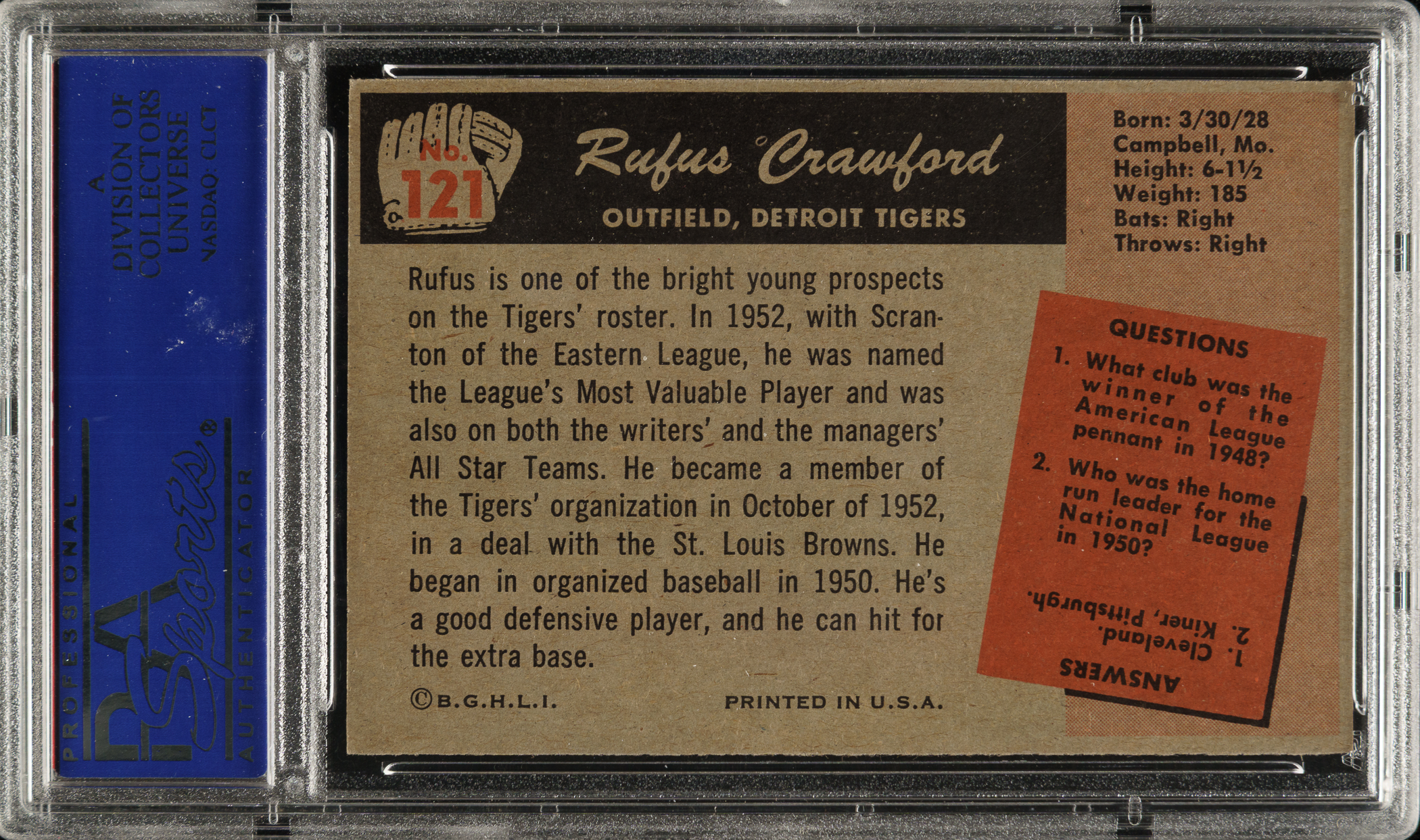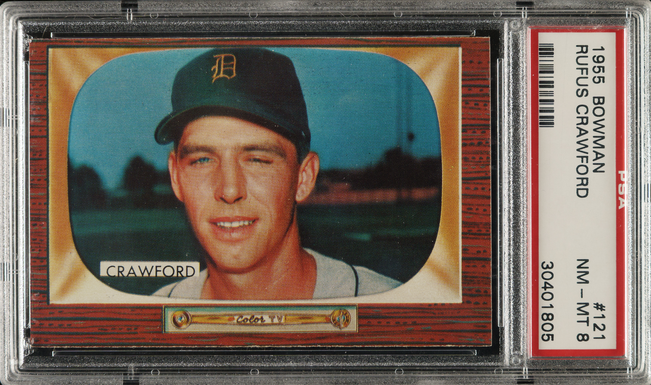Lot # 1602: 1955 Bowman #121 Rufus Crawford PSA NM-MT 8