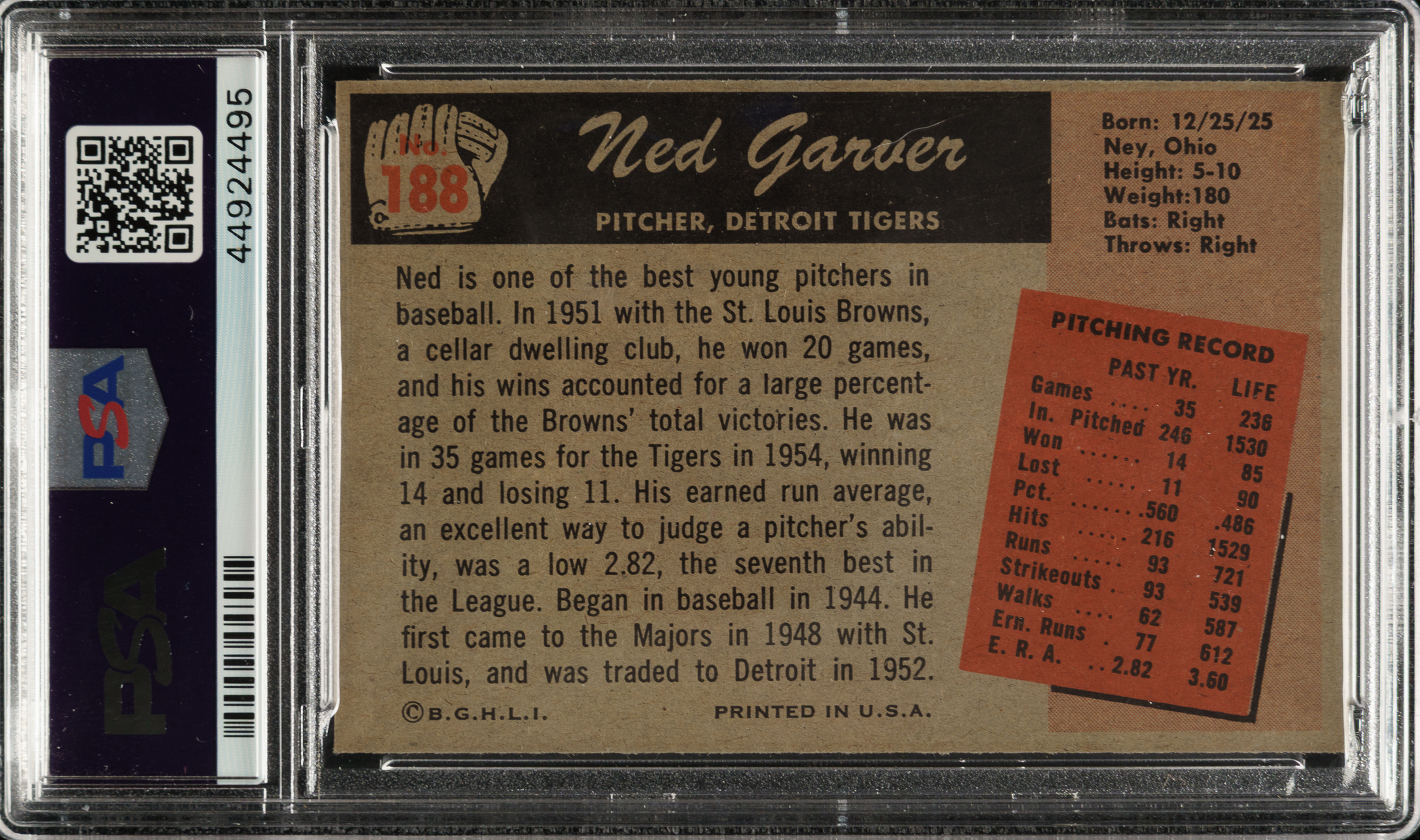 Lot # 1608: 1955 Bowman #188 Ned Garver PSA NM-MT 8