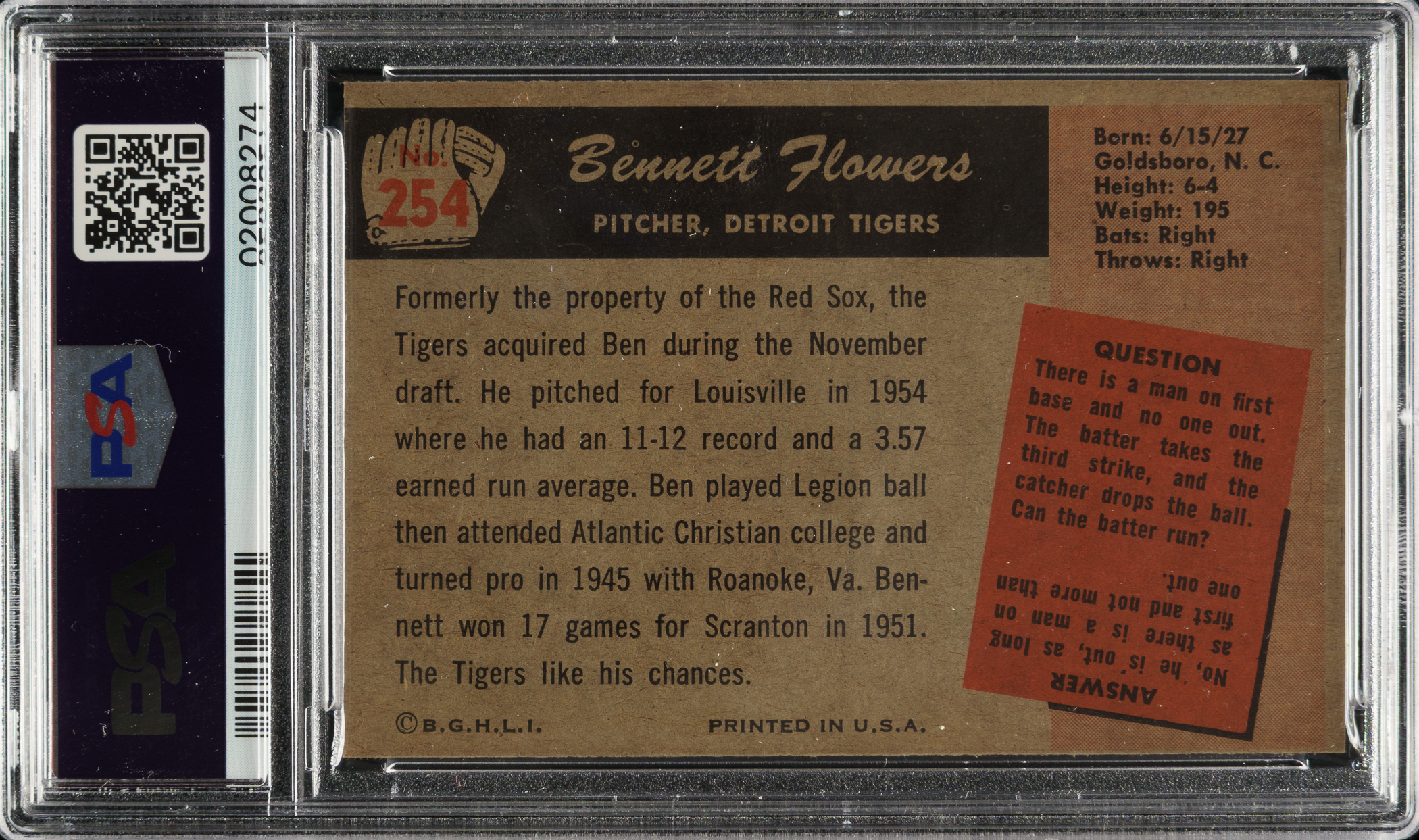 Lot # 1614: 1955 Bowman #254 Bennett Flowers PSA MINT 9