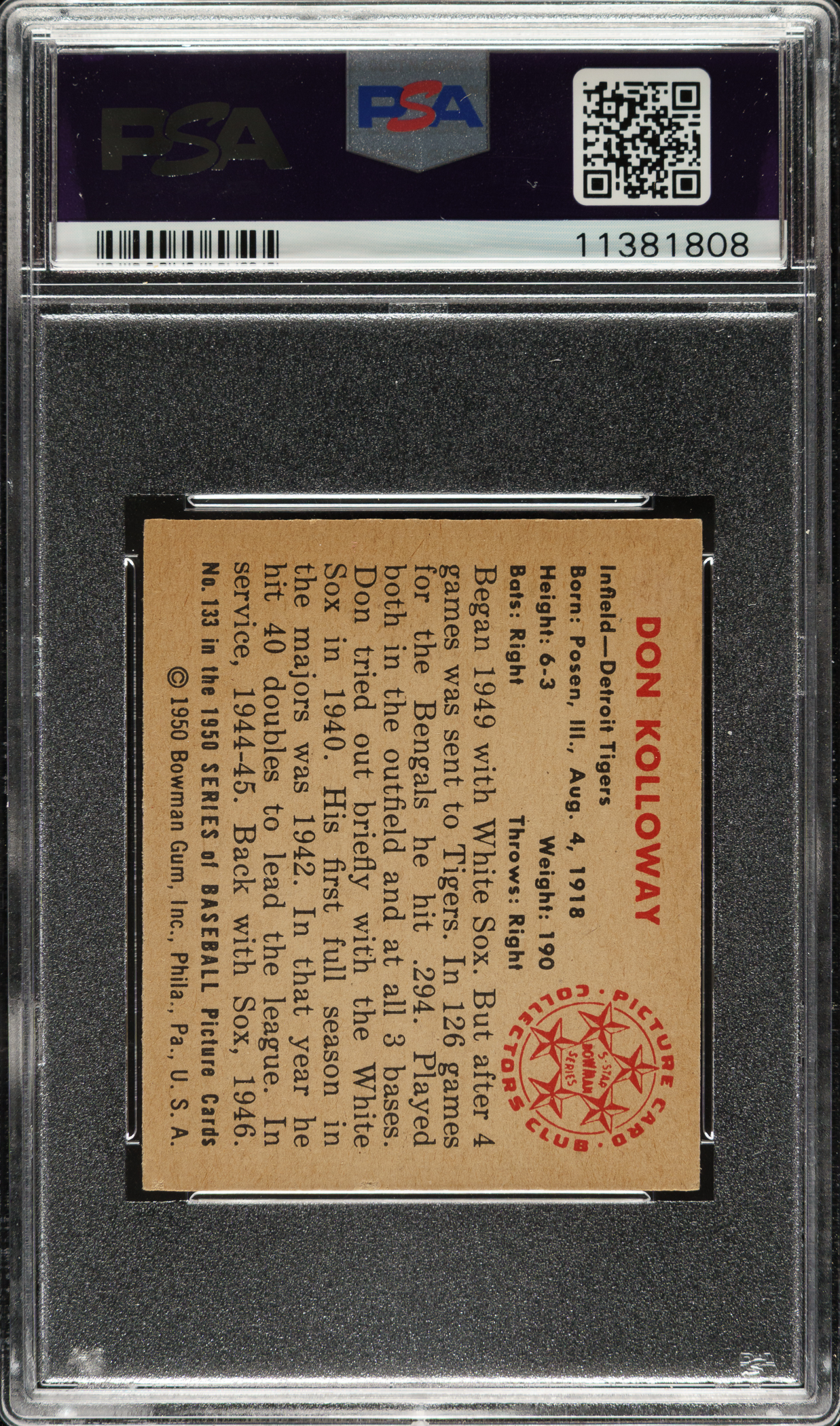 Lot # 1327: 1950 Bowman #133 Don Kolloway PSA NM-MT 8