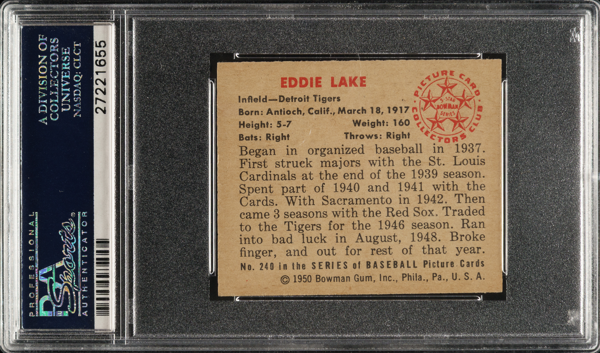 Lot # 1342: 1950 Bowman #240 Eddie Lake PSA NM-MT 8