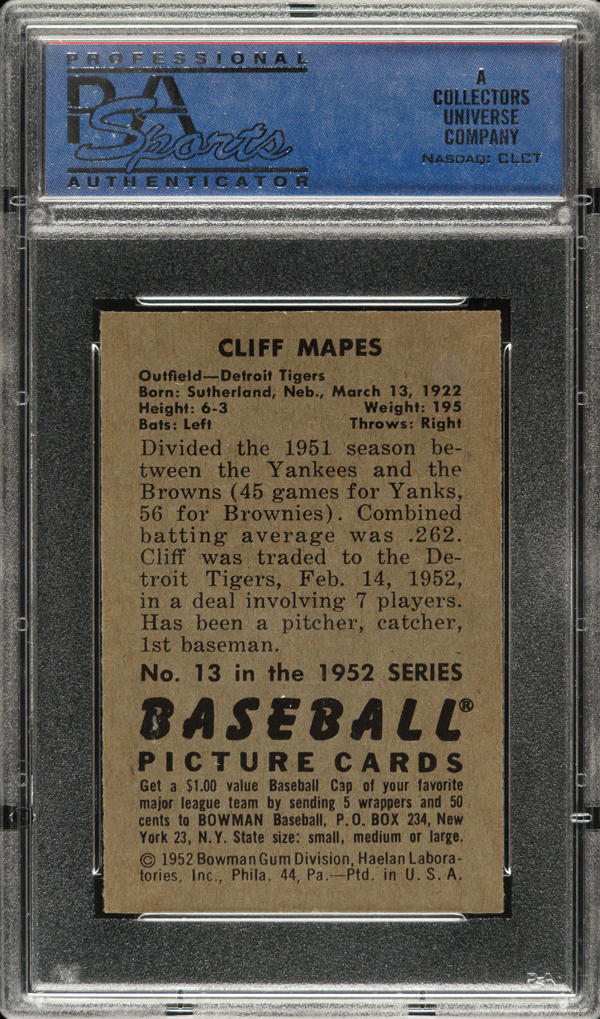 Lot # 1413: 1952 Bowman #13 Cliff Mapes PSA MINT 9