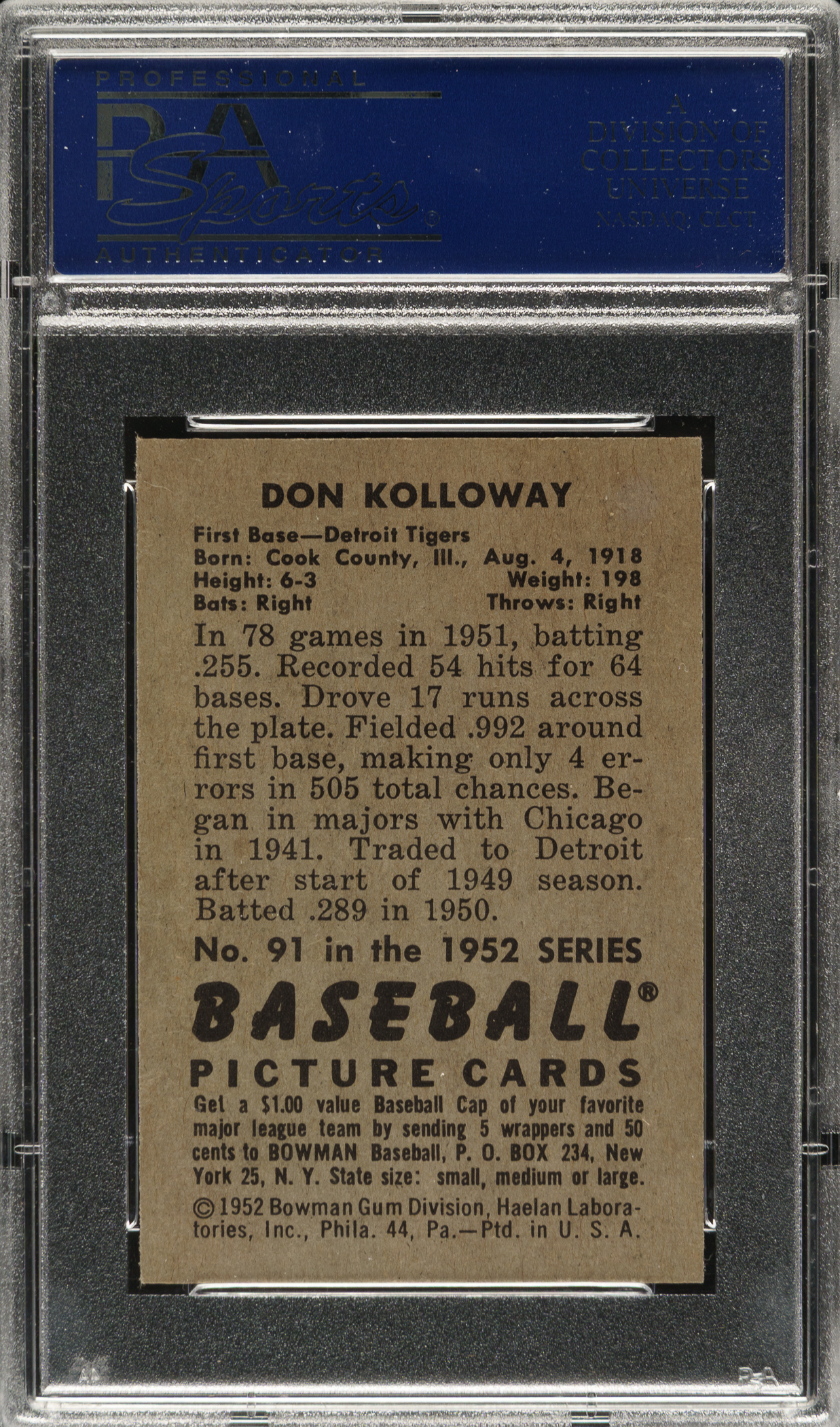 Lot # 1436: 1952 Bowman #91 Don Kolloway PSA MINT 9