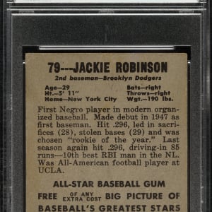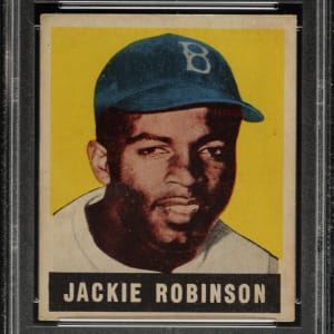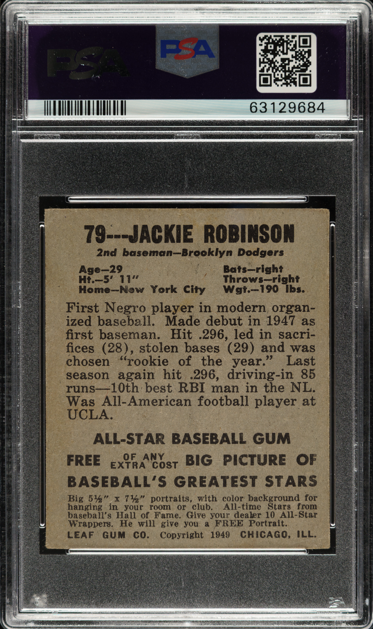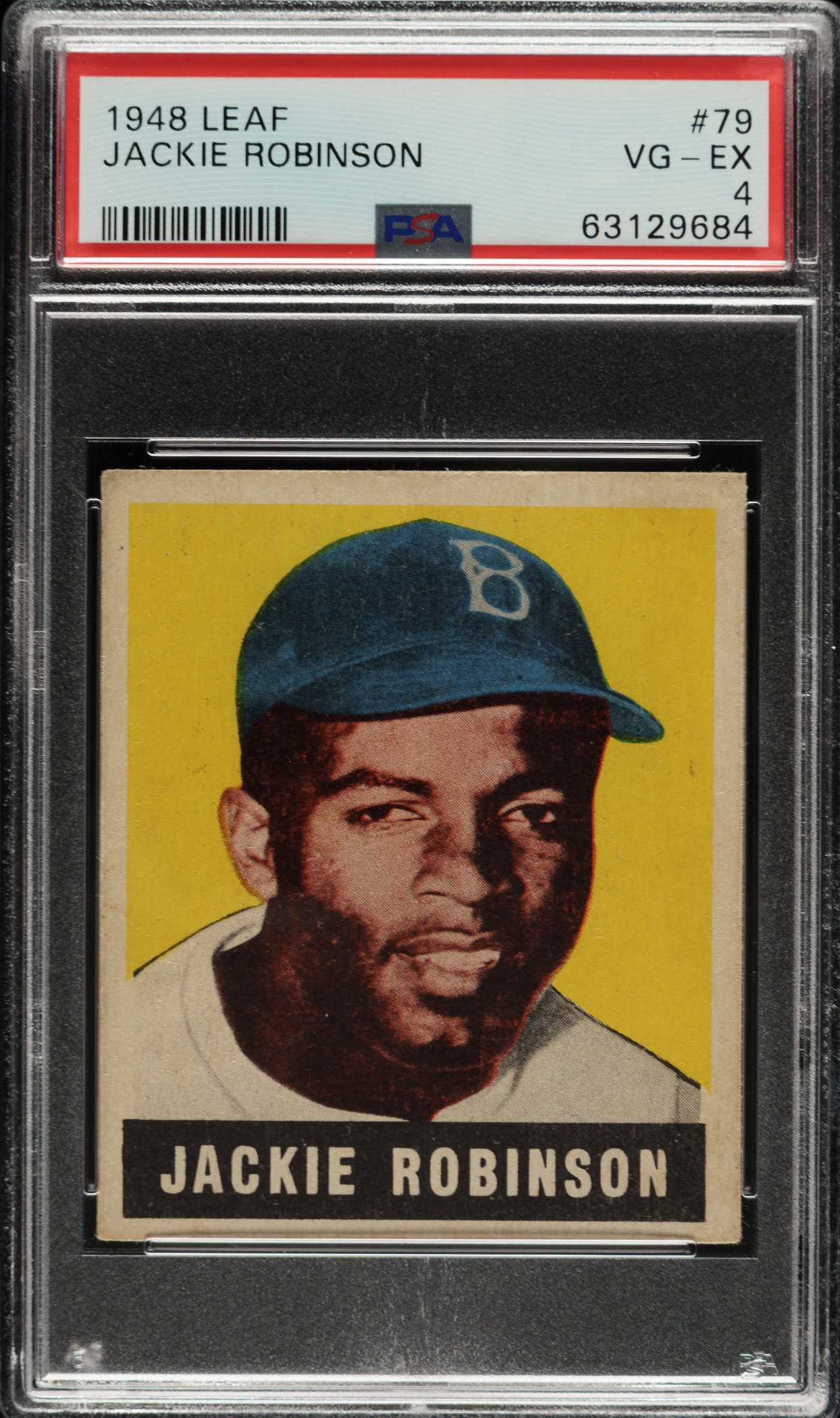 Graded VG-EX 4 by PSA. Beautiful mid-grade example of this classic rookie card featuring Brooklyn Dodgers Hall of Famer Jackie Robinson. The 1948-1949 Leaf bubble-gum card of Robinson is one of the most popular, striking, and classic of all his cards. The offered card features vibrant colors, outstanding registration, and light, even corner wear. Clean reverse. A fantastic mid-grade example.