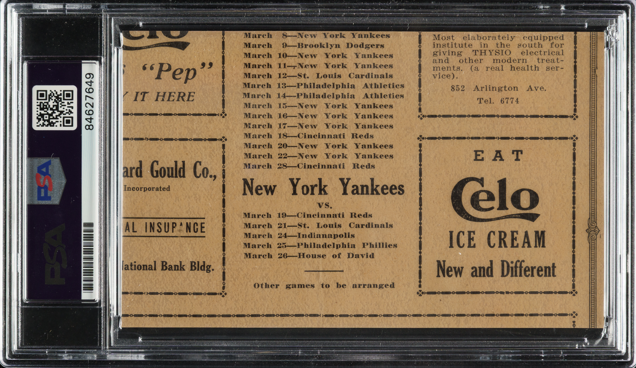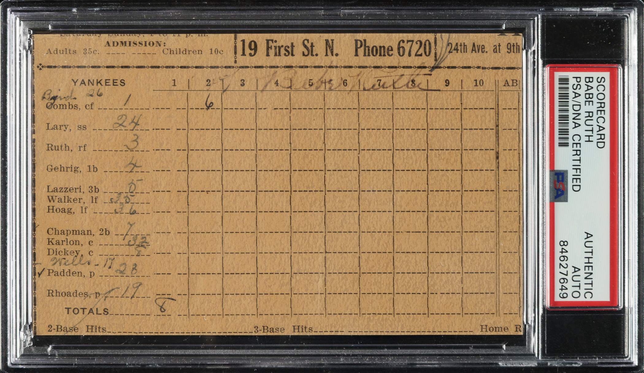 Partial scorecard from a spring training game dating from the circa 1930s, signed in black ink by Babe Ruth. Encapsulated by PSA/DNA, with the signature certified as "Authentic." Ruth's signature is slightly faded but still remains clearly legible. Ruth's name is preprinted in the lineup as batting third. The scorecard (5-3/8 x 3-3/8 inches), which is a partial section trimmed down, has several ink notations and even toning. In Fair to Good condition overall.