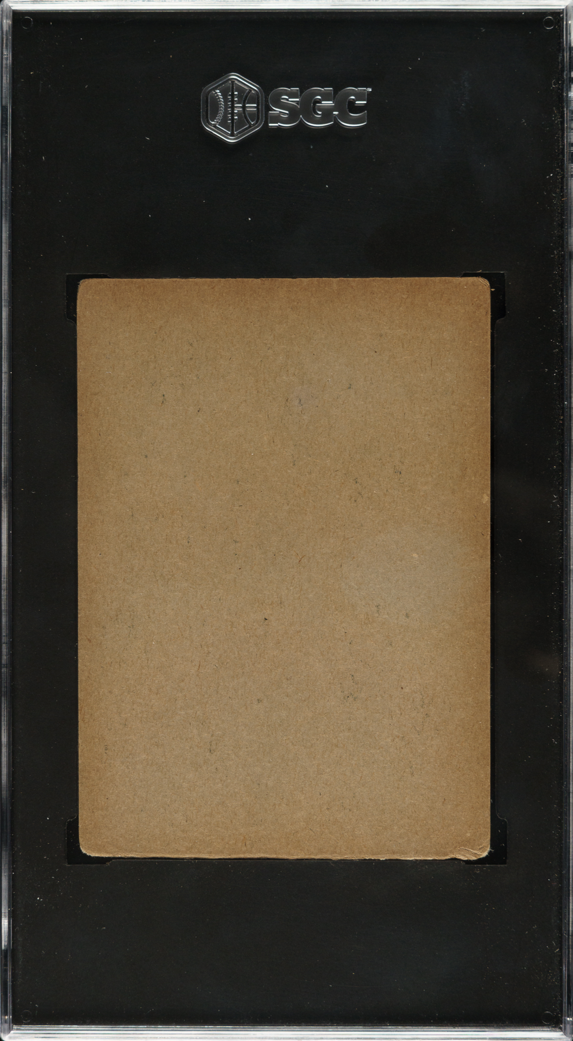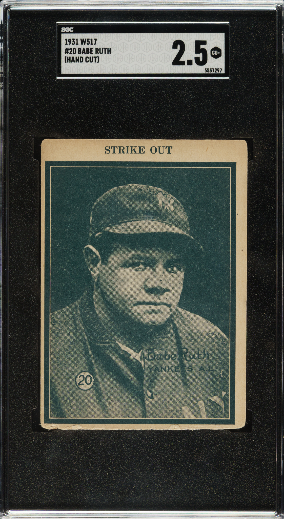 Graded GOOD+ 2.5 by SGC (submitted by REA). The 1931 W517 set features two cards of Babe Ruth. Presented in this lot is card No. 20, which pictures Babe Ruth in a striking portrait pose. Ruth and Mickey Cochrane are the only players in the 54-card set to be honored with two cards. This is one of his most unusual cards. The W517 set is much appreciated by collectors for being so different in dimension and design from most other cards featuring Ruth's likeness. It is also from an unusual era, as W517 is one of the very few card sets issued after the popular strip cards of the 1920s but just before the bubble-gum cards of the early 1930s. The popular W517 large-style strip card issue (3 x 4 inches) was originally sold in vertical strips of three, which were intended to be hand-cut by youngsters. Because of their method of issue, cards from this set are often found in somewhat rough condition (miscut, creases, back damage, etc.). This example is far nicer than usually found for this condition-sensitive issue. It has superb image quality and moderate corner wear. The blank back is clean with just light toning. "Strike Out" is printed in the top border. This is a very attractive mid-grade example of this distinctive and classic Ruth card in a very desirable condition.