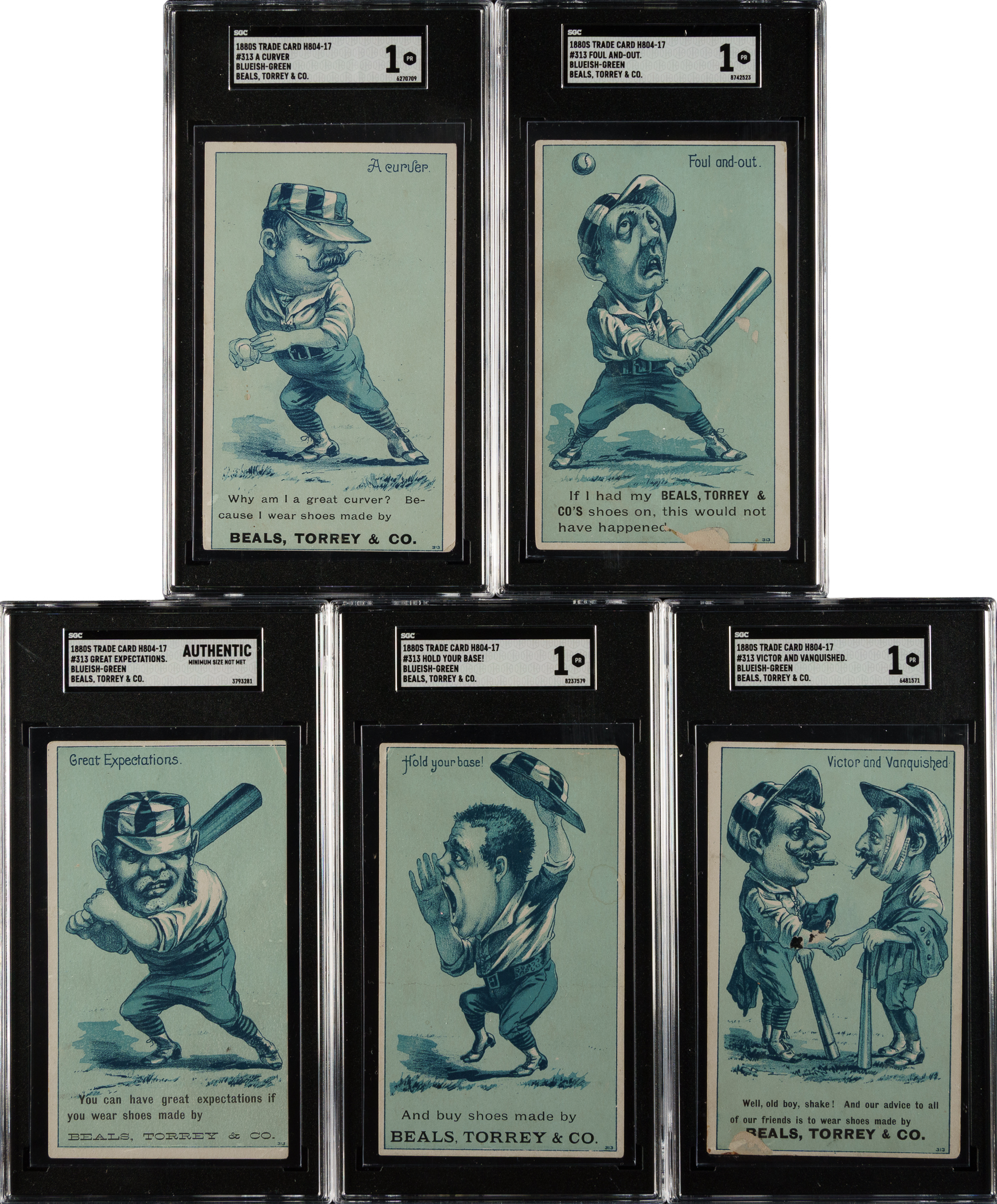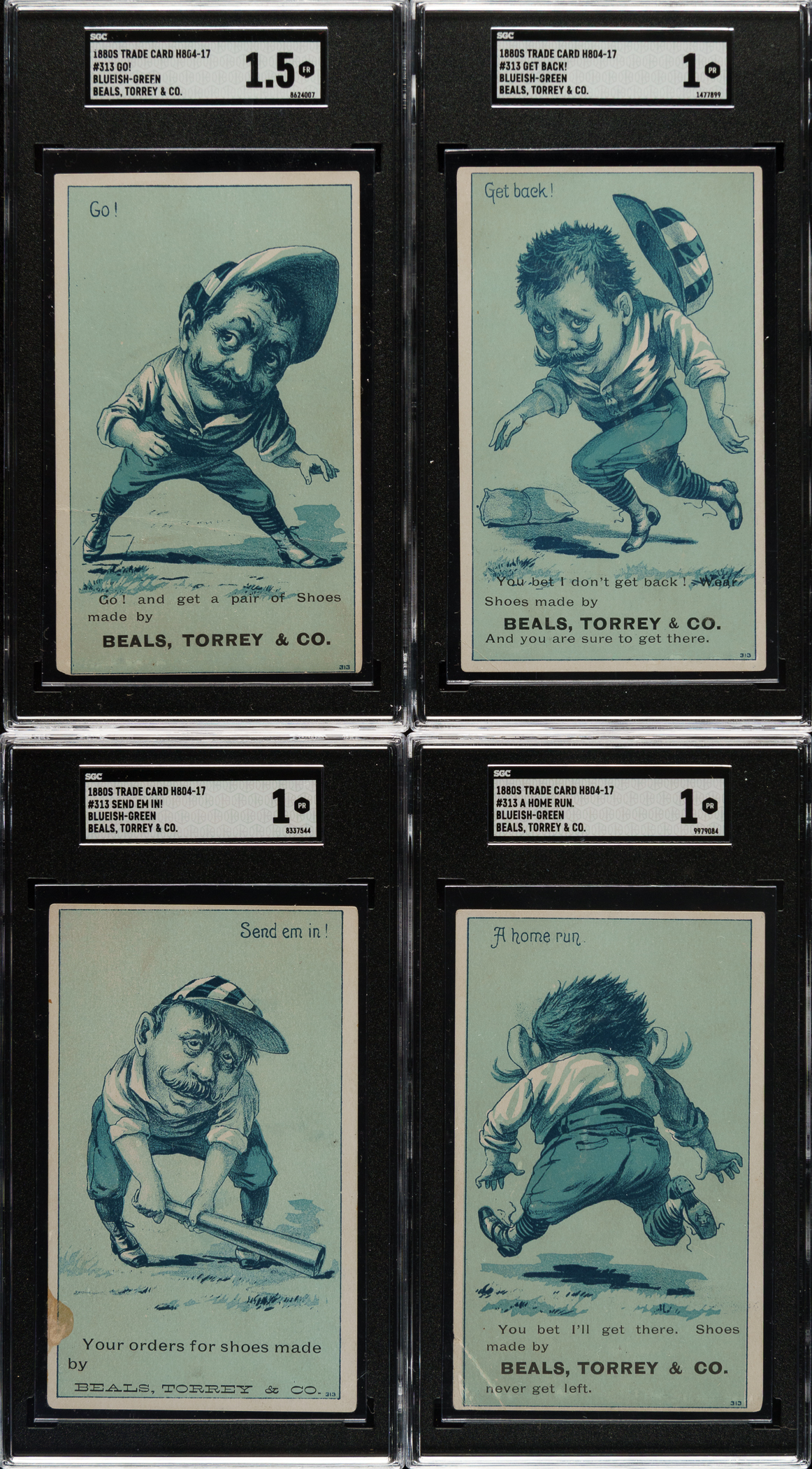 Extremely attractive complete set of H804-17 "Bluish-Green Series" trading cards. This set of nine cards issued in the 1880s is colorfully illustrated with drawings of various baseball scenes on a "bluish-green" background and a short caption at the top. These cards were produced for merchants to use as promotional advertising cards. All nine cards in this specific set feature an ad for Beals, Torrey & Co. on the front and blank backs. Each card has been graded by SGC and, as can be seen, presents much better than the assigned grade. SGC Grading Composite: FAIR 1.5 (1 card): Go!. POOR 1 (7 cards): A Curver, A Home Run, Foul and Out, Get Back, Hold Your Base!, Send Em In!, and Victor and Vanquished. Authentic (1 card): Great Expectations (minimum size not met). This is a very attractive complete set of these early baseball trade cards. Total: 9 cards.