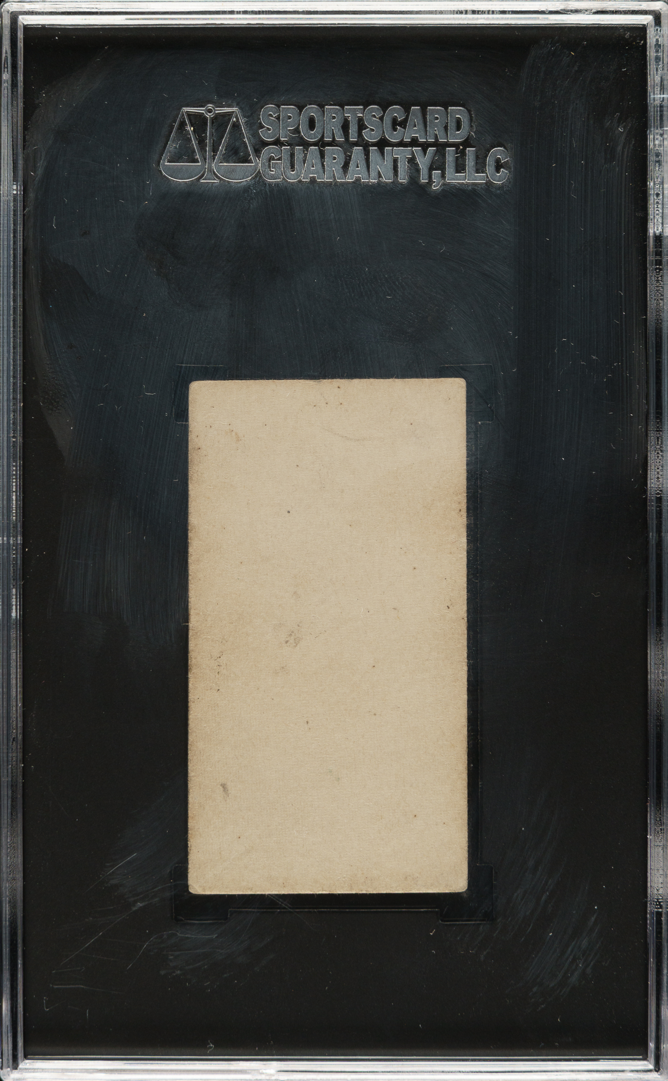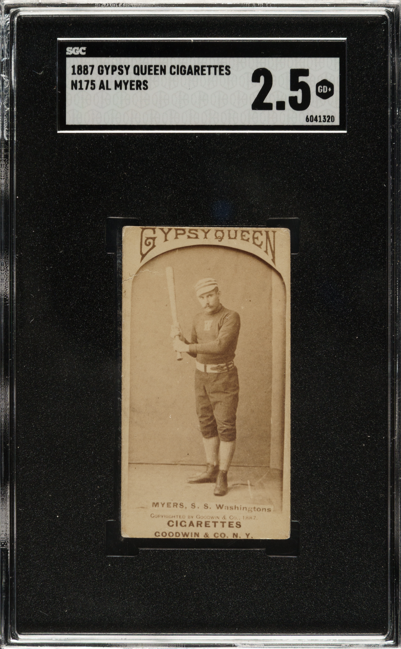 Scarce N175 "Small" Gypsy Queen of Al Myers of the Washington Nationals. This card is the same size and general format as N172 Old Judge, but with a slightly different design, and advertising for Goodwin's Gypsy Queen brand of tobacco. There has always been some confusion as to the catalog number of the smaller Gypsy Queens (similar in size to N172s and not to be confused with the even rarer large N175 Gypsy Queens, of which nine different cards are known) because the catalog does not distinguish between the two sizes of cards represented by "N175." This card has an extremely strong image, a quality highly prized among 19th century collectors. Graded GOOD+ 2.5 by SGC (submitted by REA), the card displays even touches of wear at the corners and a small crease on the left border, which accounts for the grade. The blank reverse is lightly toned but otherwise clean. This is an extremely sharp-looking sample from this rare and unusual Old Judge-related 19th century issue.