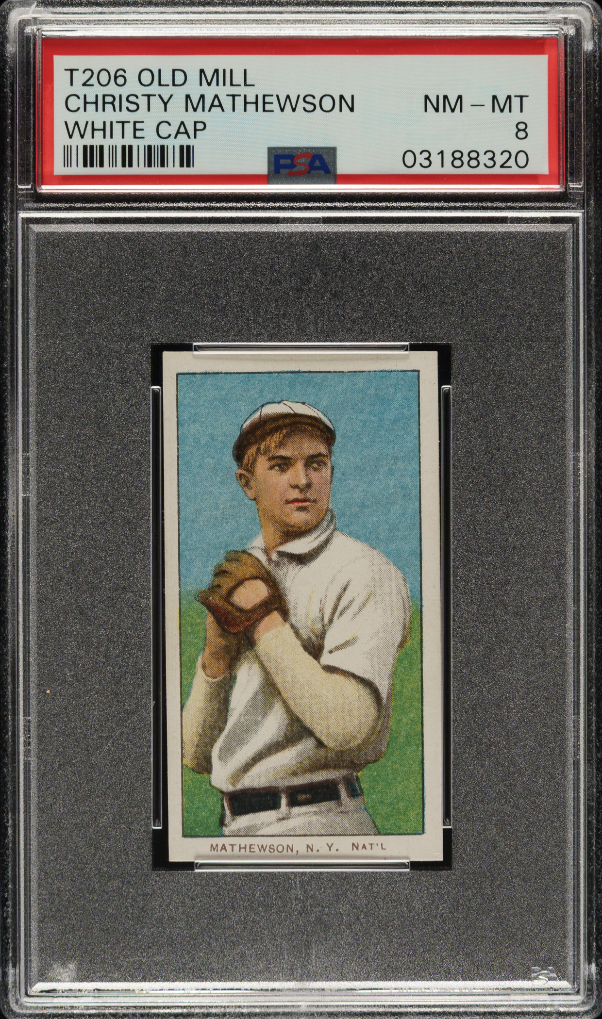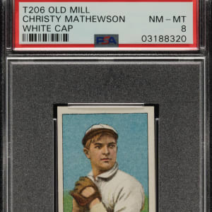 Graded NM-MT 8 by PSA. This is a stunning high-grade example of one of the three classic poses of Christy Mathewson from the T206 White Borders series. It is further distinguished by its Old Mill advertising back, making it the only example with this back graded at this level by PSA with none higher! The T206 Christy Mathewson white cap pose is one of the most popular of all T206s, and one of the most highly regarded of all Mathewson cards. This example has a particularly bold image, extremely vibrant colors, and outstanding centering. This is very sharp-looking card, extremely clean both front and back, with four strong corners. Boldly printed reverse. This a tremendous high-grade example of one of the key Hall of Famers from the legendary T206 set, and it would be at home in any world-class T206, Christy Mathewson, or Hall of Fame collection.