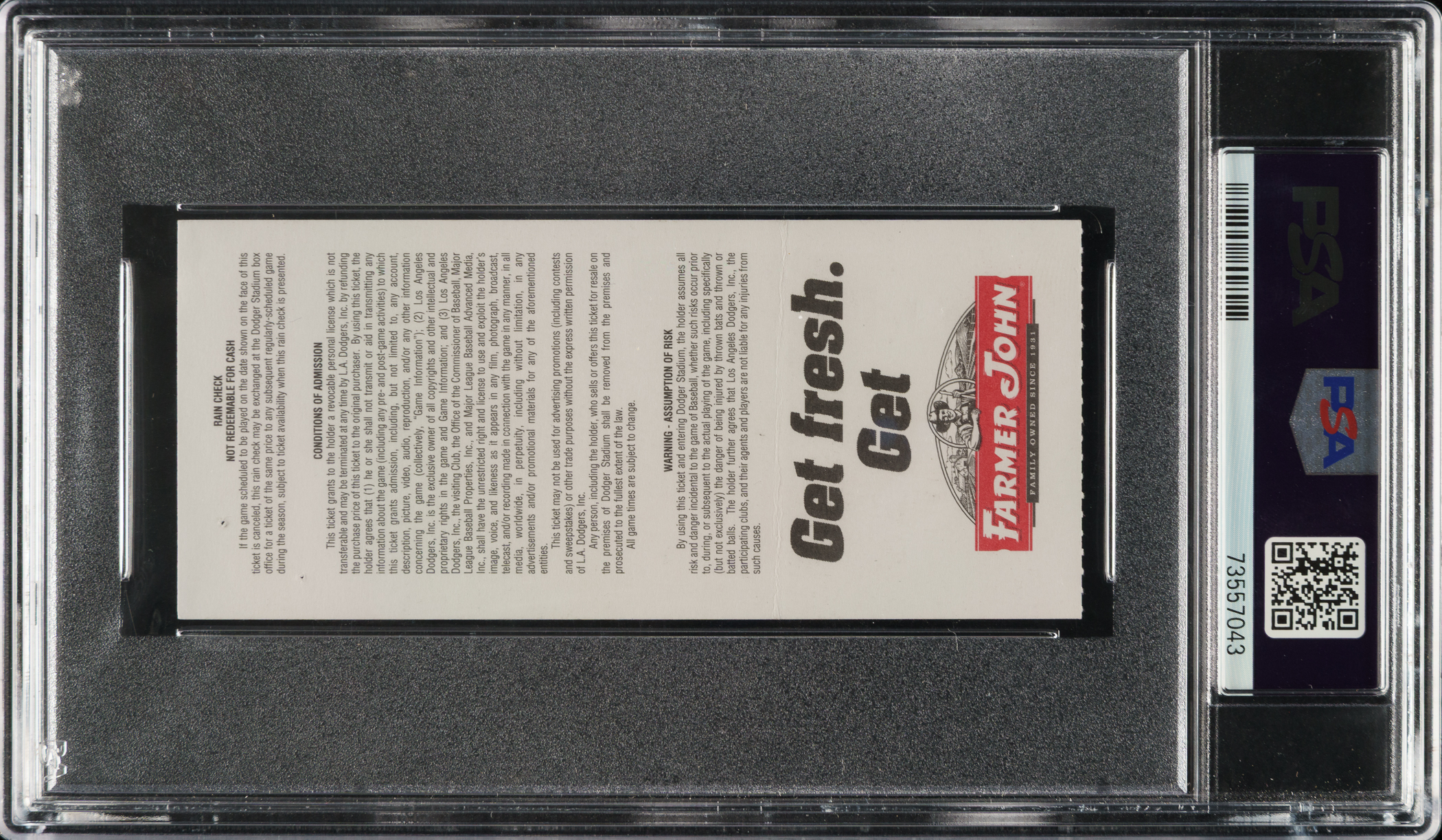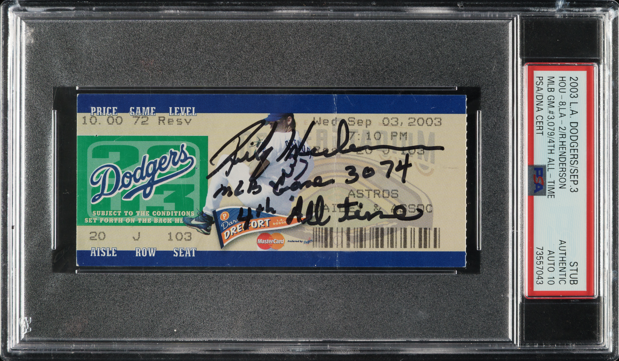 Ticket stub (4.5 x 2 inches) issued to a game between the Los Angeles Dodgers and Houston Astros on September 3rd, 2003, at Dodger Stadium, signed by Rickey Henderson. Henderson has signed the ticket "Rickey Henderson/MLB Game 3,074/4th All Time" in black marker on the front. PSA/DNA has encapsulated the ticket, grading the signature GEM MINT 10 and certifying the ticket as "Authentic." Henderson finished his career with 3,081 games played, which ranks fourth all-time. Please note that the PSA/DNA slab incorrectly identifies Henderson's game played total.