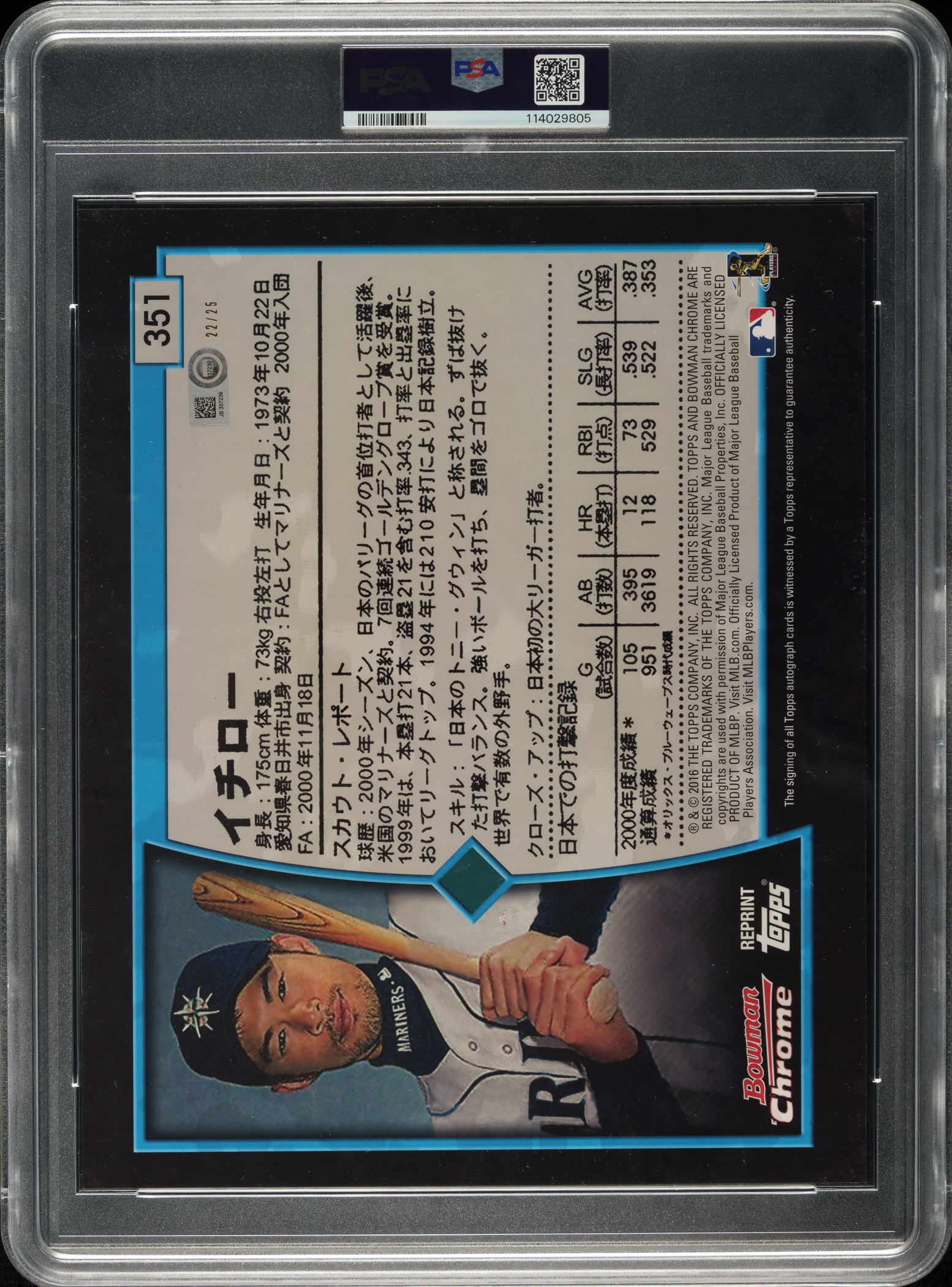 Presented is an oversized refractor tribute to Seattle Mariners Hall of Famer Ichiro Suzuki’s celebrated 2001 Bowman Chrome rookie card. PSA/DNA has encapsulated the card, grading the signature GEM MINT 10 and certifying the card as "Authentic." This 2016 Bowman Chrome 2001 Rookie Japanese Jumbo Autograph card is signed by Suzuki in bold blue ink on the front. Produced by Topps Authentics, this is a rare Orange Refractor variation and bears a "22/25" limitation number on the Japanese-text reverse. Excellent condition overall. An MLB certification sticker is affixed to the reverse. Extremely few of these jumbo refractor autographs have reached the secondary market, making this orange Japanese variation a standout target for advanced Ichiro collectors and anyone seeking a distinctive centerpiece that complements the standard-size Bowman Chrome rookie. Total dimensions: 8 x 10 inches.