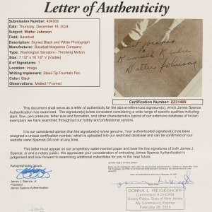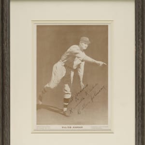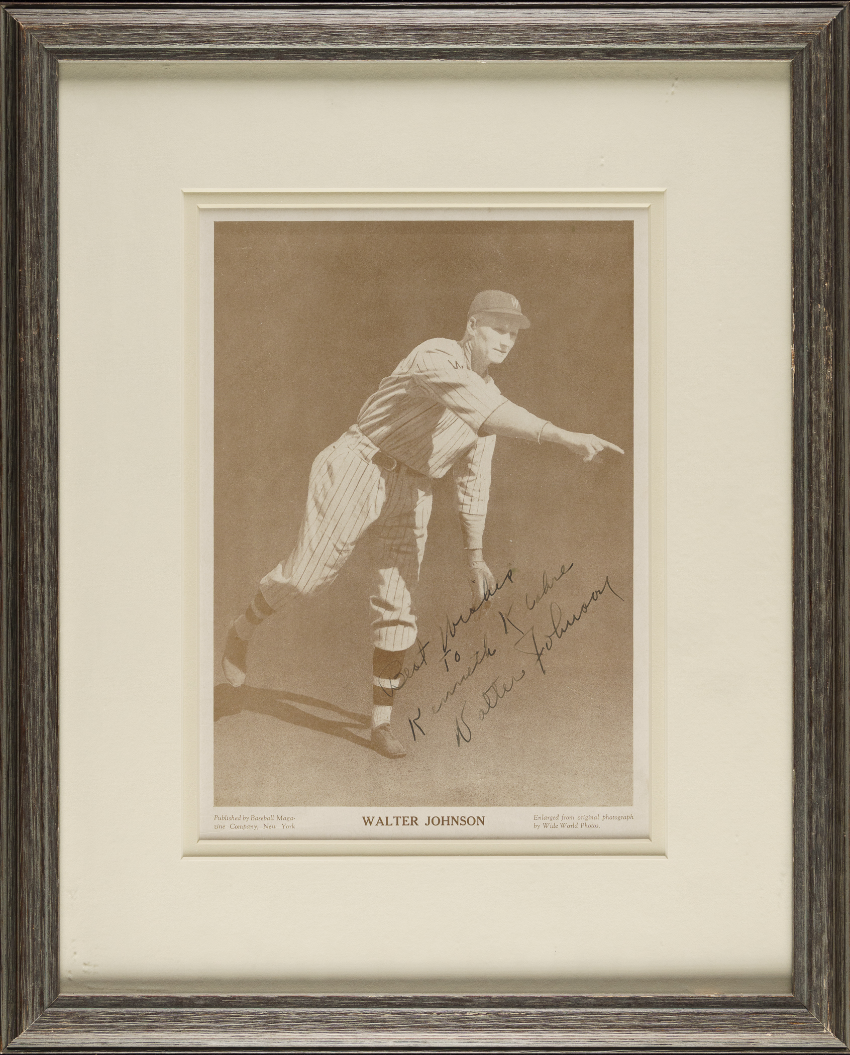 M114 Baseball Magazine premium of Walter Johnson, signed by him in black ink below his image, presented in a framed display. Johnson has inscribed "Best Wishes / To / Kenneth Kelabre (sic) / Walter Johnson." The premium (7-3/8 x 10-1/4 inches, visible dimensions) displays light creasing throughout. In Good condition overall. Matted and framed to total dimensions of 14 x 17.5 inches. Full LOA from James Spence/JSA. The size/weight of this item requires that there will be an additional shipping charge for this lot.