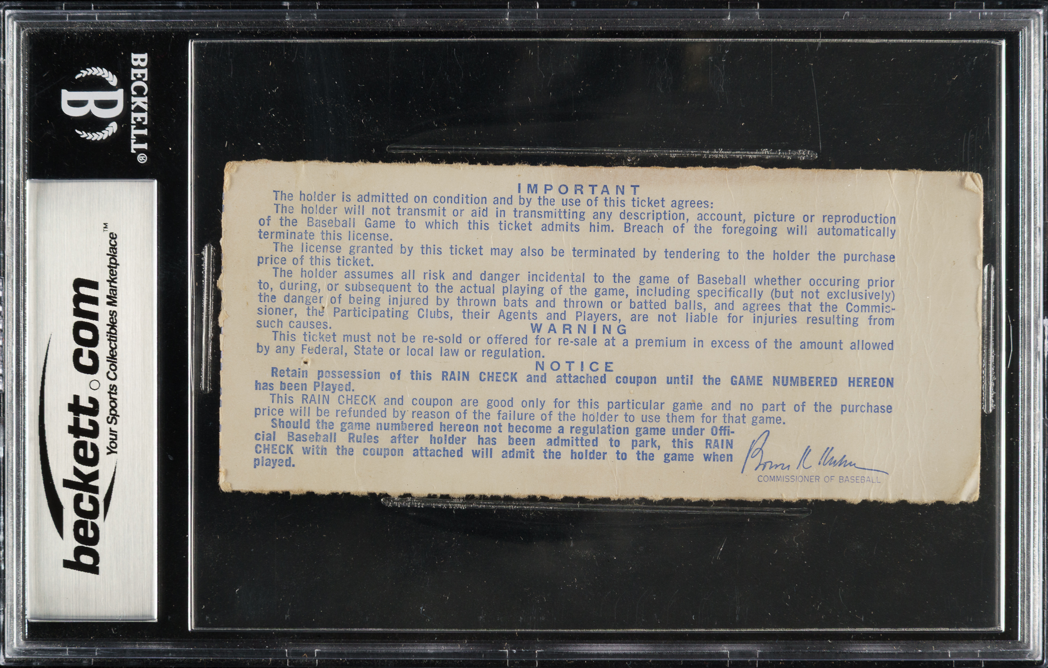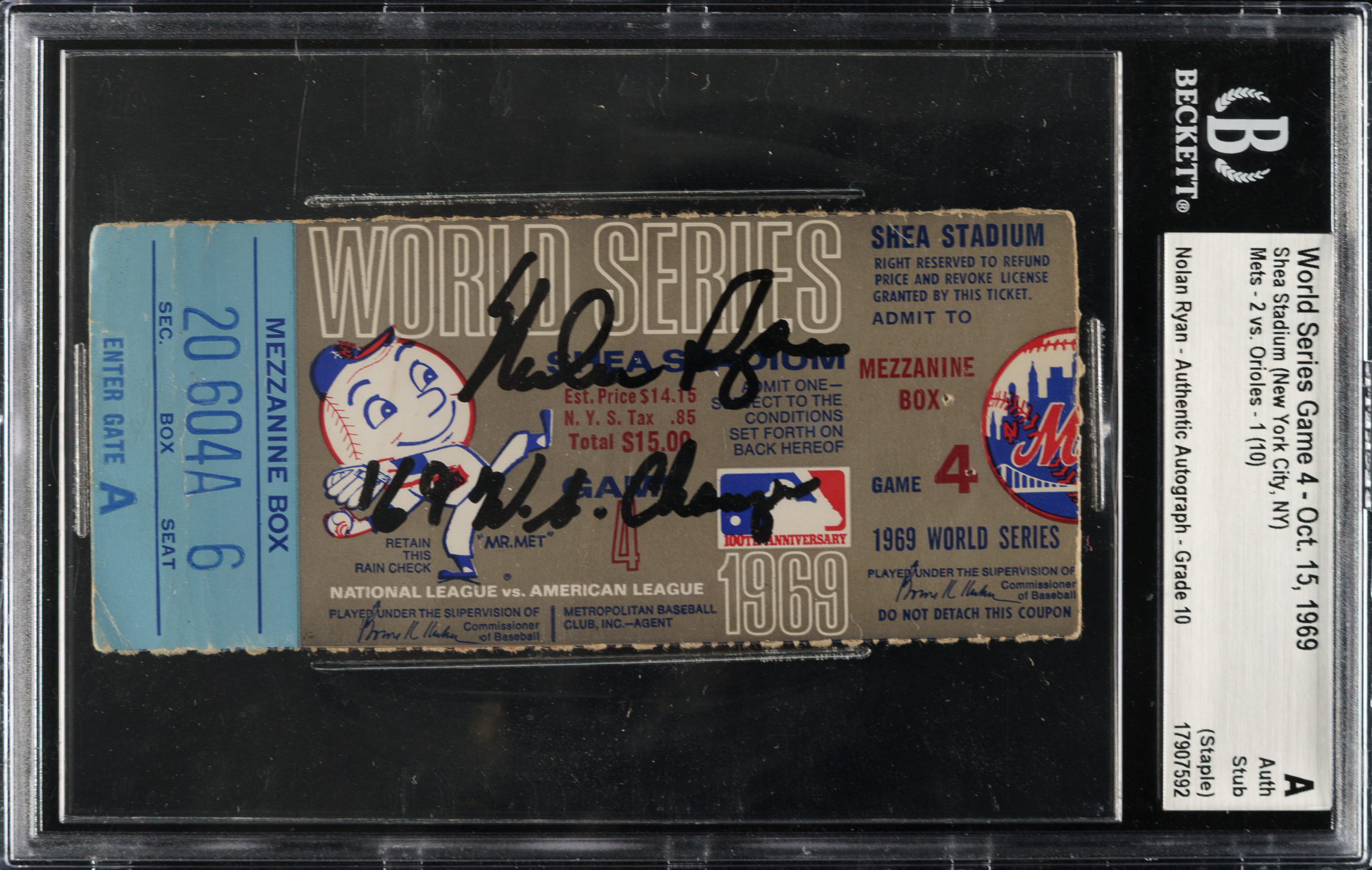 Ticket stub issued for Game 4 of the 1969 World Series between the New York Mets and Baltimore Orioles held at Shea Stadium on October 15th, signed by Hall of Fame pitcher Nolan Ryan. Ryan has signed the ticket "Nolan Ryan/'69 World Champs" in black marker on the front. Encapsulated by Beckett, who has graded the signature GEM MINT 10 and certified the ticket as "Authentic." The Mets defeated the Orioles 2-1 in Game 4 as Tom Seaver went the distance and J.C. Martin's bunt led to a throwing error in the 10th inning that brought home the decisive run. The Mets went on to defeat the heavily favored Orioles in five games to capture their first World Championship in franchise history. The ticket stub (5-1/8 x 2-1/4 inches) displays creasing and staple holes. Fair condition overall.