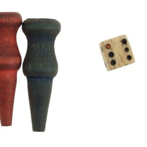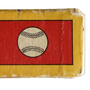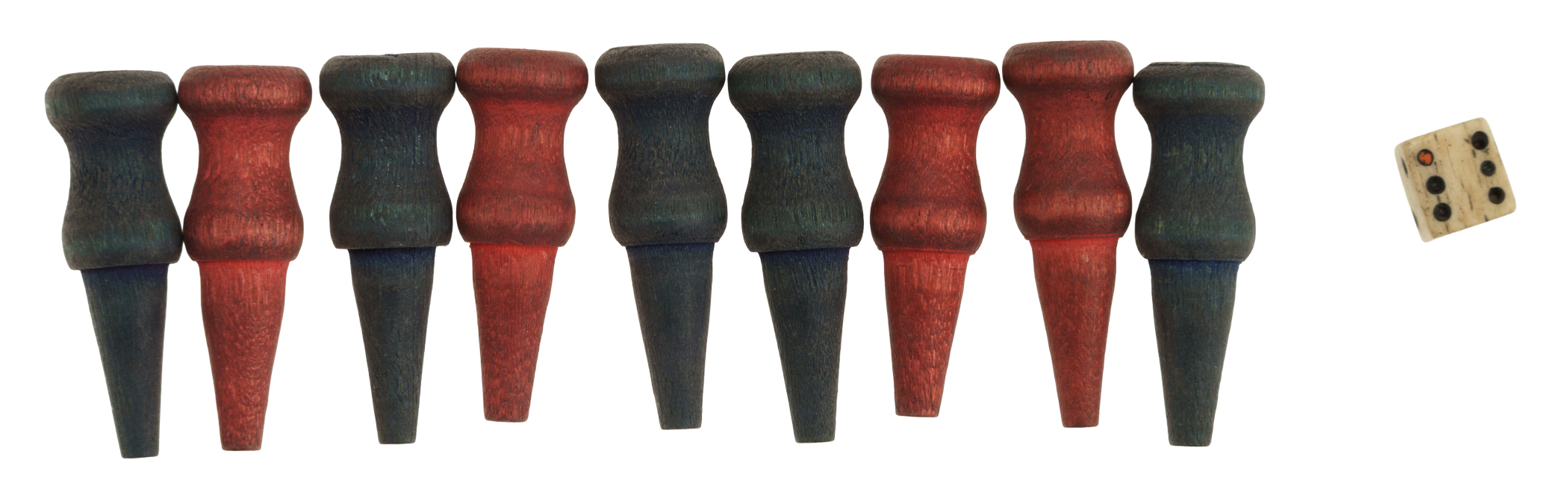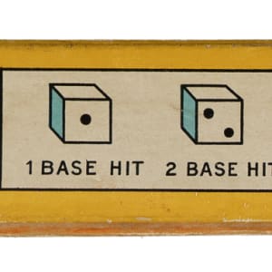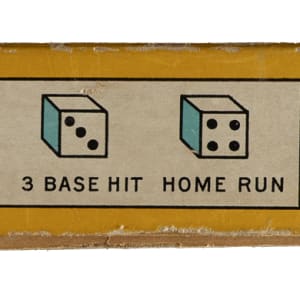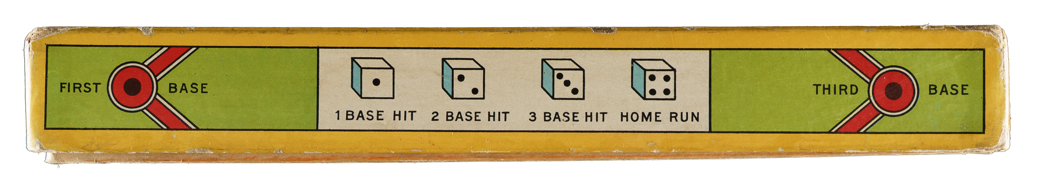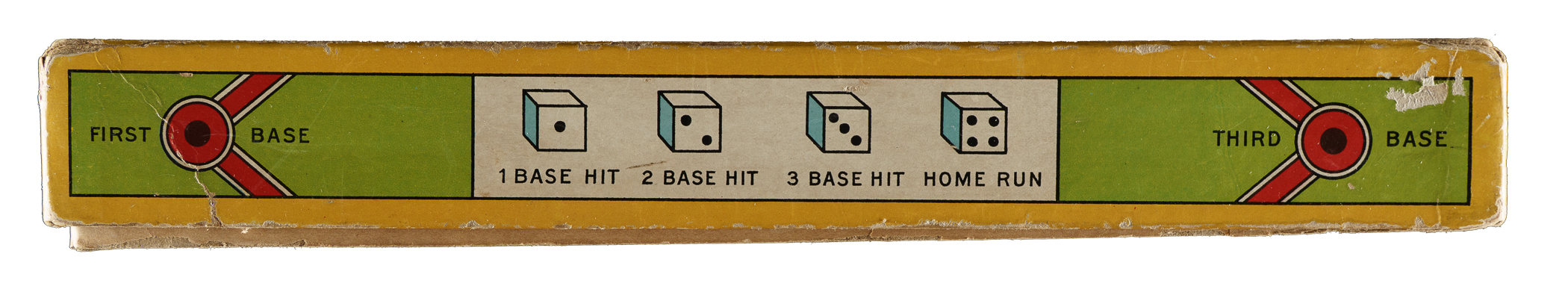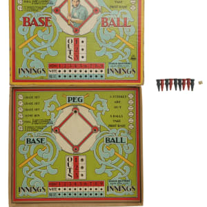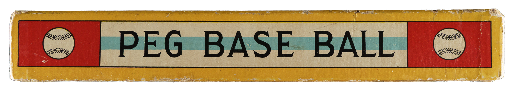 Circa 1910s Peg Base Ball Game by Parker Brothers. The game includes two dice, nine wooden pieces (five blue and four red), the game board, and the original box. The instructions are affixed to the underside of the lid. The box (12 x 11 x 1.5 inches) has heavy wear but remains intact. Good condition overall. The size/weight of this item requires that there will be an additional shipping charge for this lot.