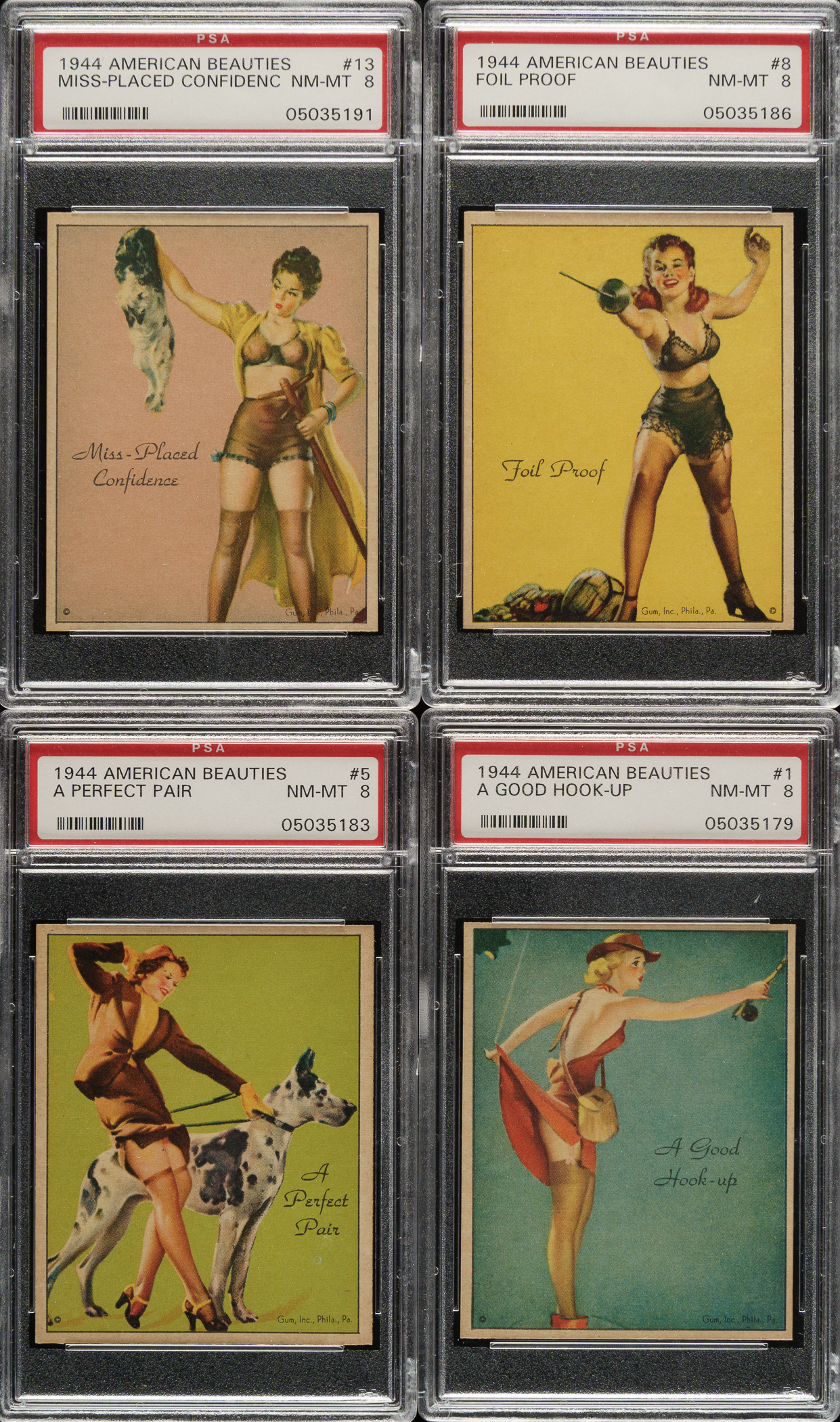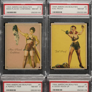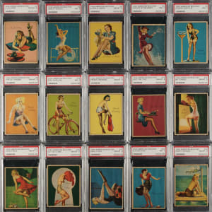 Complete 24-card set of this beautiful full-color classic 1940s “girlie” issue. In the style of arcade cards of the era, in 1944 Gum, Inc., issued cards featuring beautiful pinup artwork by the top illustrators of the day. The public’s appetite for pinup art exploded during this era, with images by artists such as Gil Elvgren, Zoe Mozert, and Earl Moran appearing on everything from matchbook covers to ink blotters to calendars. To avoid potential criticism from the general public, Gum, Inc., sold these very risqué cards in tobacco stores, rather than in the candy stores where the kids frequently visited. Each card has been professionally graded and encapsulated by PSA as this set ranks 11th on their set registry with a 7.71 GPA. PSA Grading Composite: NM-MT 8 (17 cards): #1, 2, 4, 5, 8, 9, 11, 12, 13, 14, 15, 16, 17, 19, 20, 21, and 24. NM 7 (7 cards): #3, 6, 7, 10, 18, 22, and 23. This very attractive set is crisp and clean, with vibrant colors. Total: 24 cards. The size/weight of this item requires that there will be an additional shipping charge for this lot.