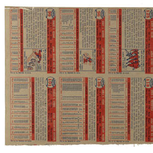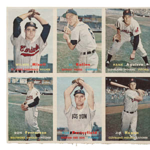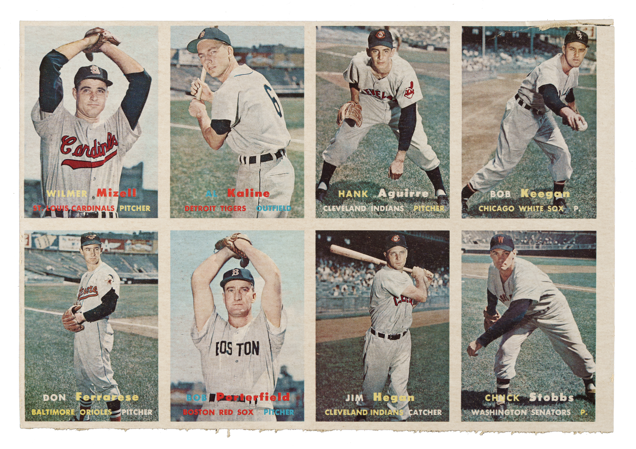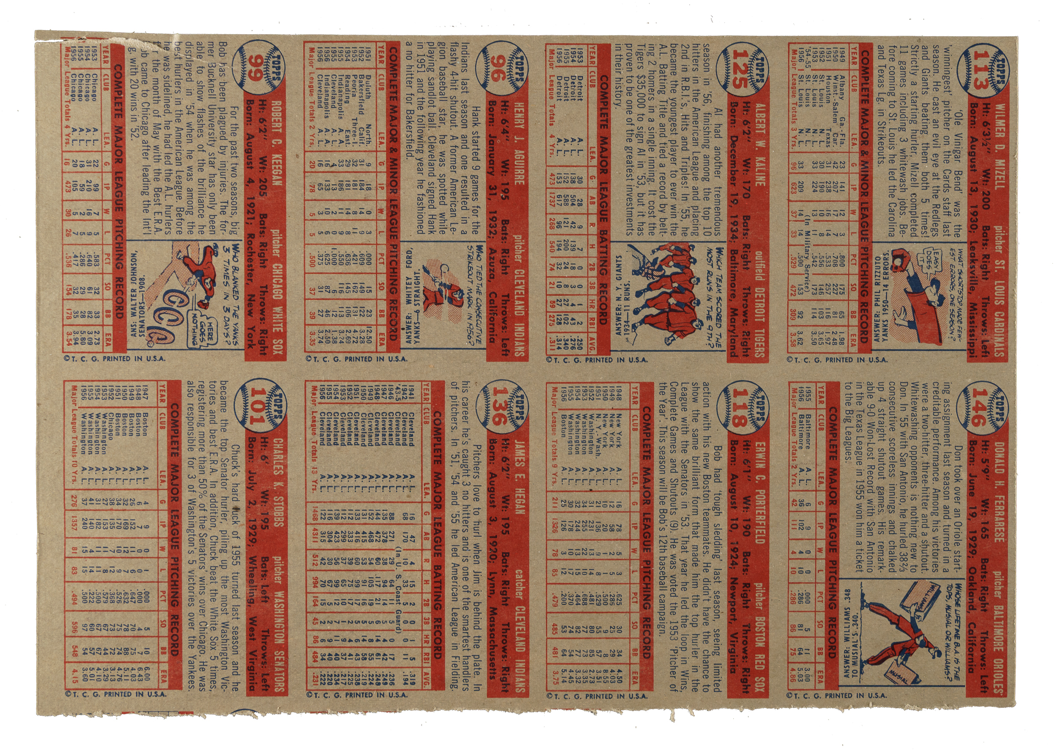 Presented is an eight-card uncut panel (10-1/8 x 7 inches) of 1957 Topps cards highlighted by Hall of Famer Al Kaline. This is a final-production panel with fully printed backs. The cards appearing on this panel are #96 Aguirre, 99 Keegan, 101 Stobbs, 113 Mizell, 118 Porterfield, 125 Kaline (HOF), 136 Hegan, and 146 Ferrarese. This desirable segment has been cut down from a larger production sheet (1957 Topps were printed in 132-card production sheets). This panel originates from the very well-known find of 1957 Topps sheets discovered years ago, most of which were heavily damaged. Some full sheets and many partial sheets in various conditions were salvageable. This panel was almost certainly cut from a heavily damaged sheet. The panel possesses tremendous visual appeal but has light rippling throughout and a small tear on the top border. A worthy addition to any Al Kaline or Topps collection.