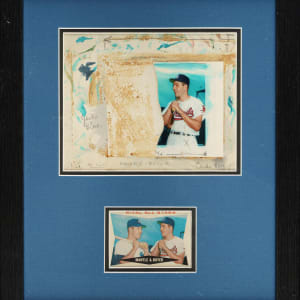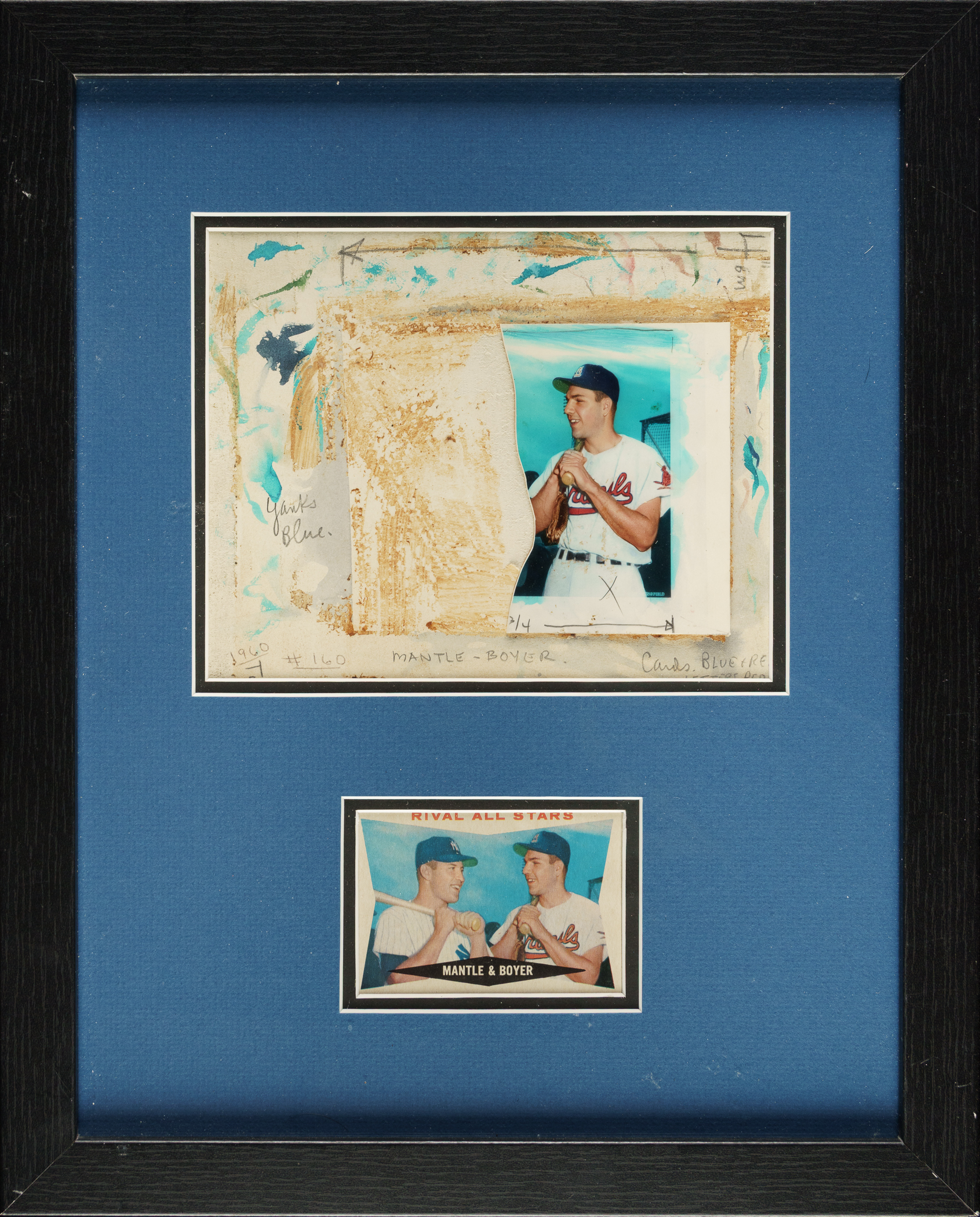 Offered is the original flexichrome artwork that was used to produce card #160 Rival All Stars featuring Ken Boyer and Mickey Mantle from the 1963 Topps baseball set. This artwork was used to create the image of Boyer along the right portion of the card (when being viewed horizontally as intended). The original flexichrome artwork measures 2.5 x 4 inches (affixed to a larger thick backing, 7.25 x 5.75 inches) and has editorial notations on the front, including the identification "Mantle-Boyer" written in pencil. Accompanied by an example of the final issued card on which this work appears. Matted and framed to total dimensions of 12.5 x 15.5 inches. Total: 2 items (artwork and card). The size/weight of this item requires that there will be an additional shipping charge for this lot.